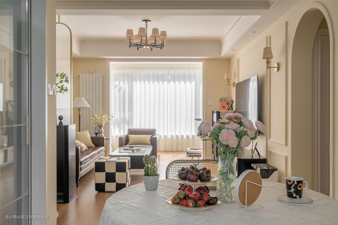 餐厅墙上选择浓郁历史感的挂钟,轻盈的碎花餐桌布+餐桌上的鲜花和绿植,精致度满分,营造极具烟火气的生活场景。