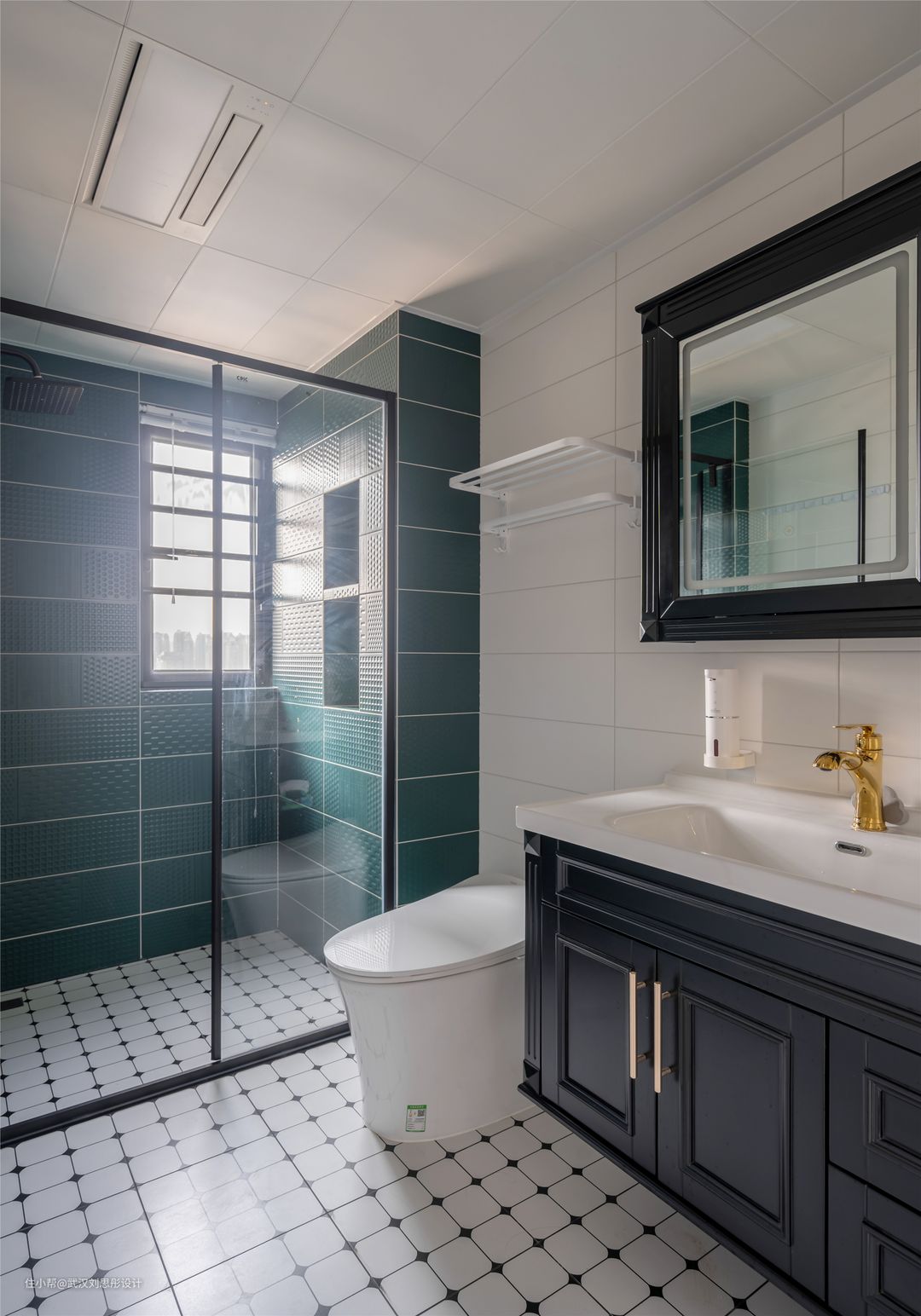 卫生间墙面以墨绿色+白色瓷砖为主,淋浴区嵌入壁龛,实用的同时更有格调。