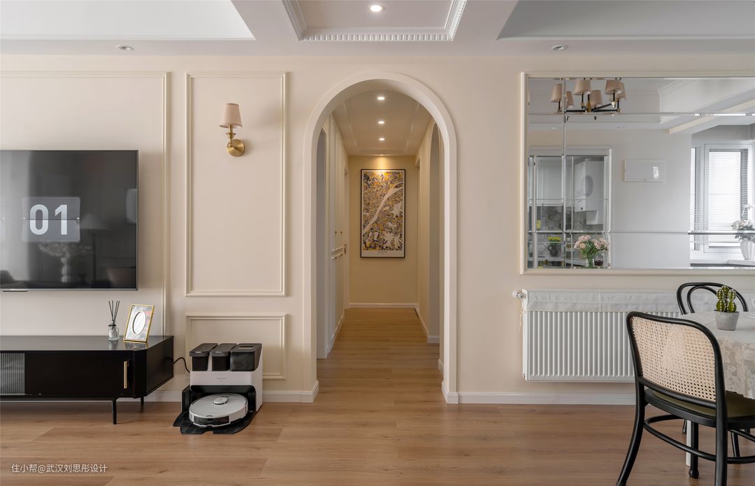 入户右边做了一面隔断,长虹玻璃的朦胧感和复古格调的深色鞋柜,可以将常用的鞋子摆放入内。玄关角落的极具高级美感的换鞋凳,搭配实用又精致的挂钩和穿衣镜,将回家的氛围营造的满满的。