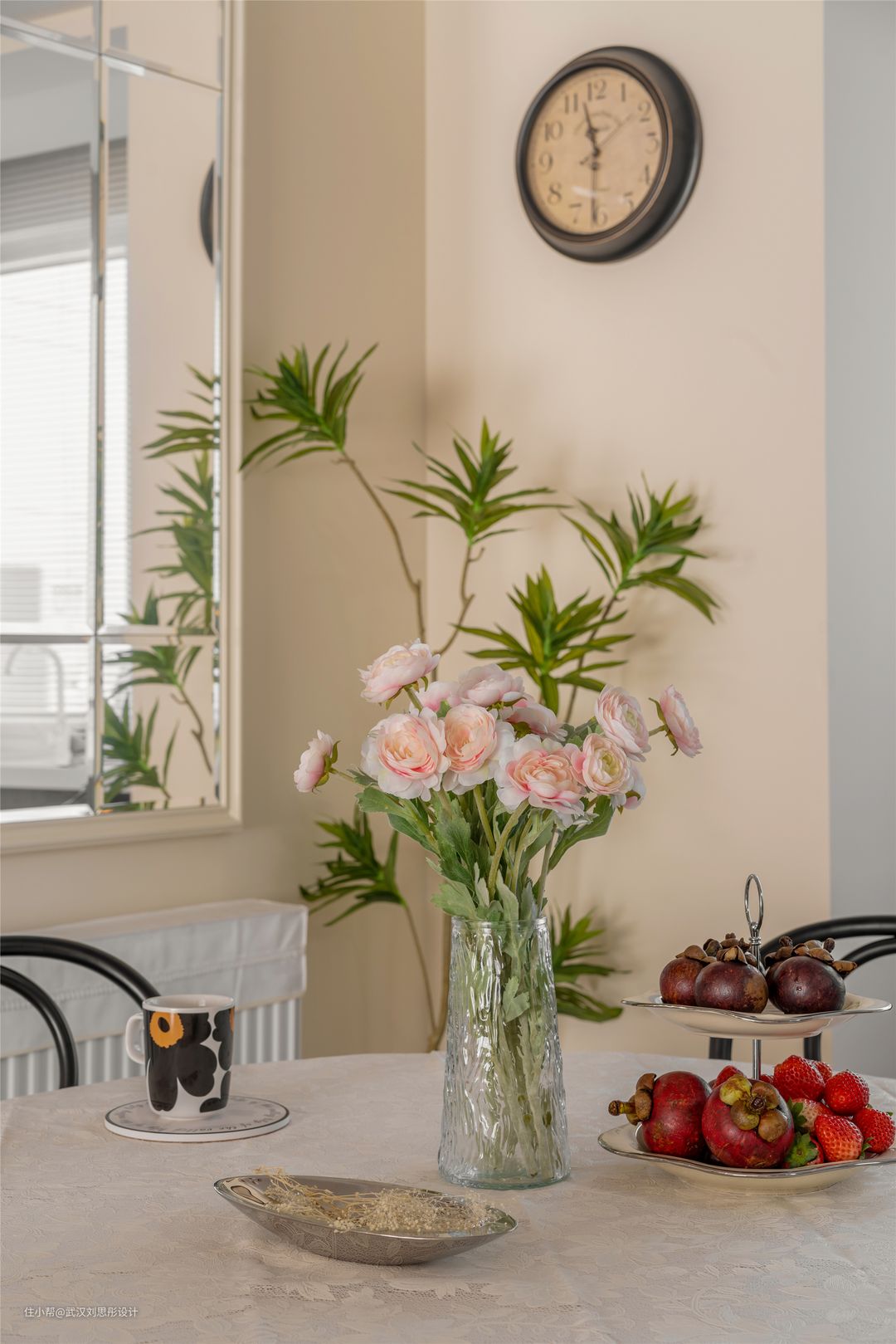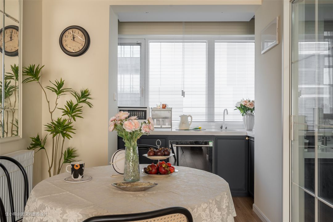 餐厅墙上选择浓郁历史感的挂钟,轻盈的碎花餐桌布+餐桌上的鲜花和绿植,精致度满分,营造极具烟火气的生活场景。