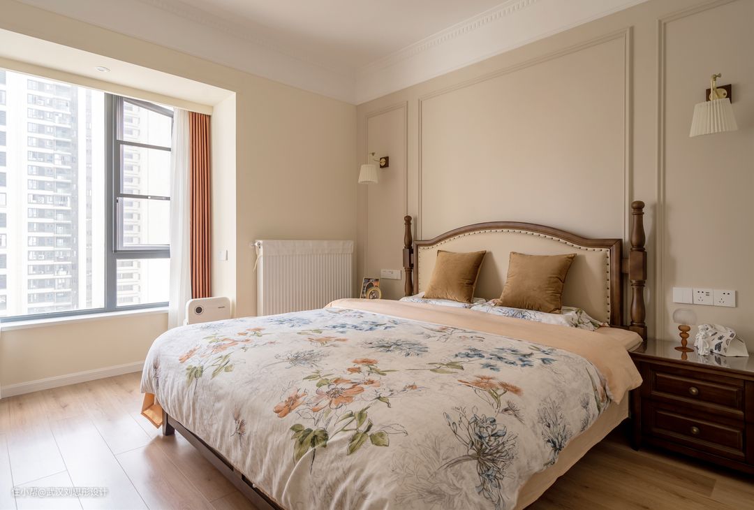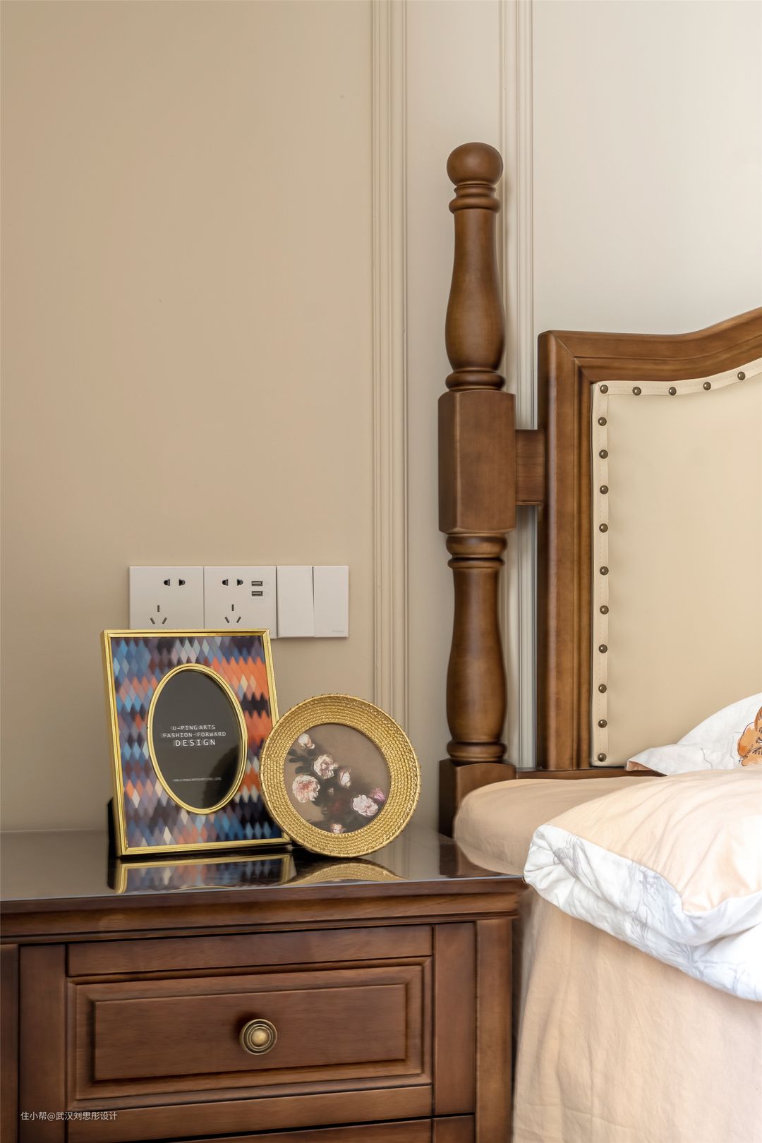 深木色的床头柜,充满质感又沉稳,搭配具有年代感的相框,构建出怀旧的韵味,浪漫之余让空间变得更丰富了起来。