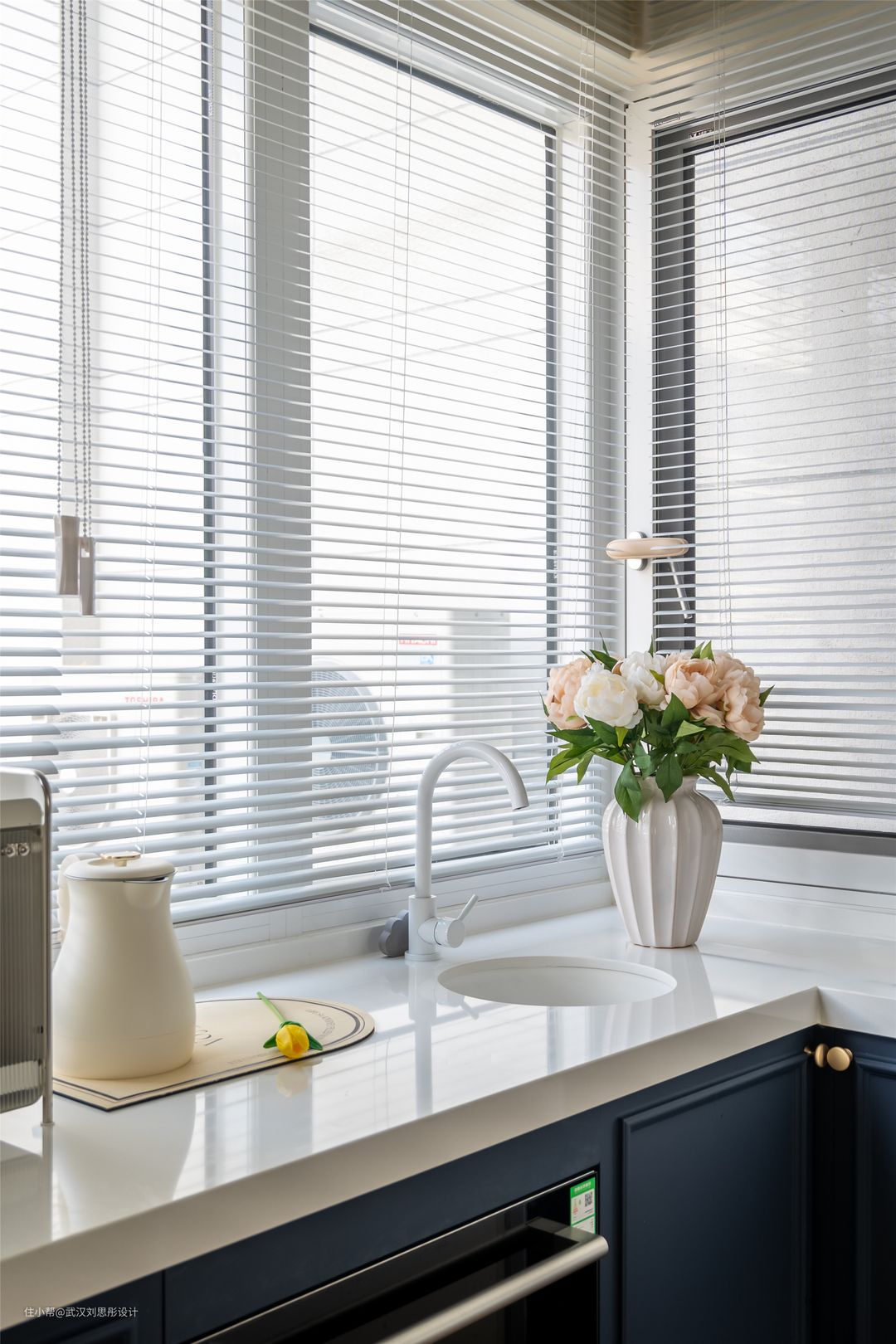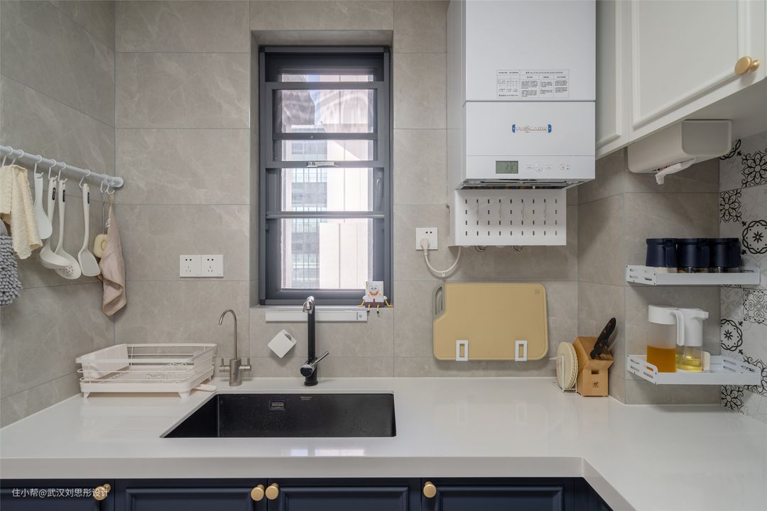 #寻找1%的厨房 厨房选用了米色系瓷砖,复古的靛蓝色橱柜搭配黄铜色哑光拉手,白色的吊柜,复古而精致的小细节,被拿捏的恰到好处。