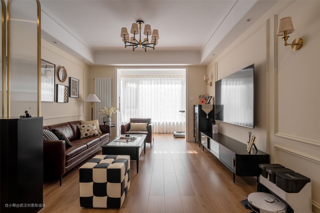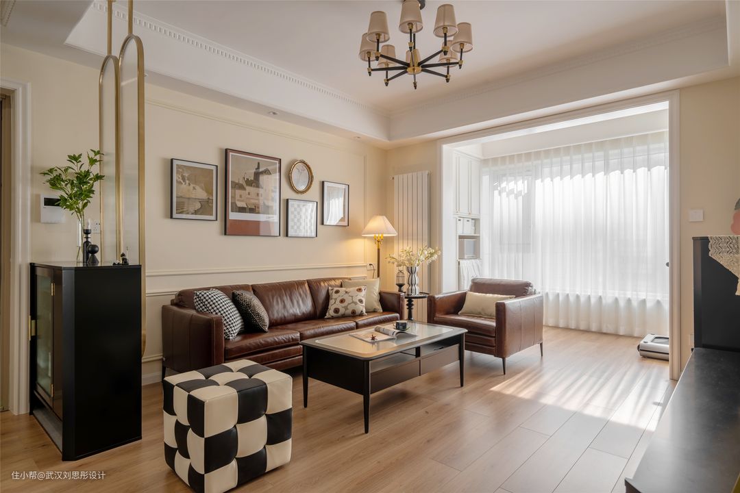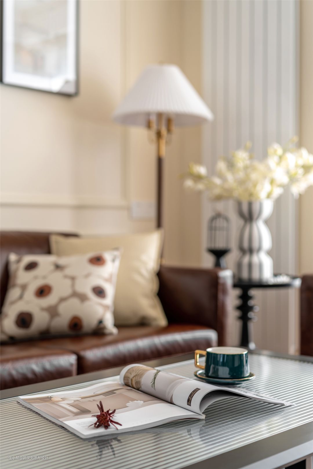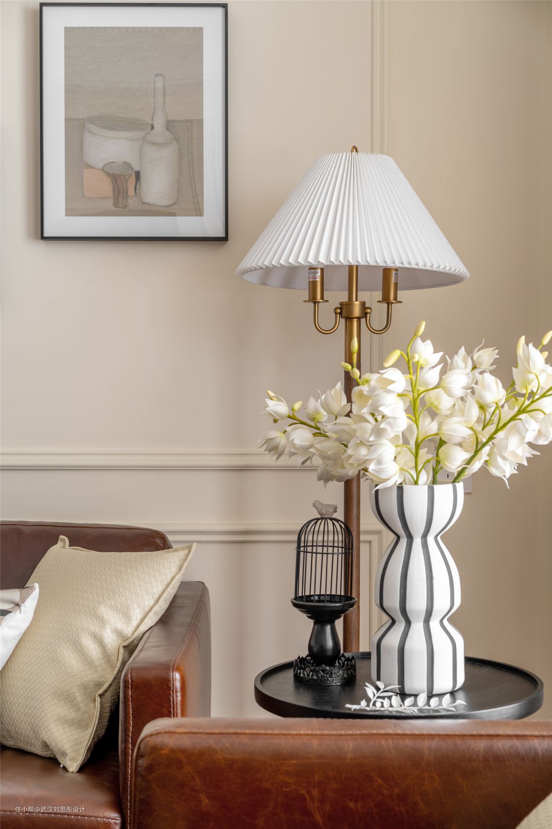 深棕色的沙发+千鸟格抱枕+百褶灯罩的落地灯,搭配黑白手绘花瓶和复古装饰画,为空间增添一抹俏皮古典韵味。