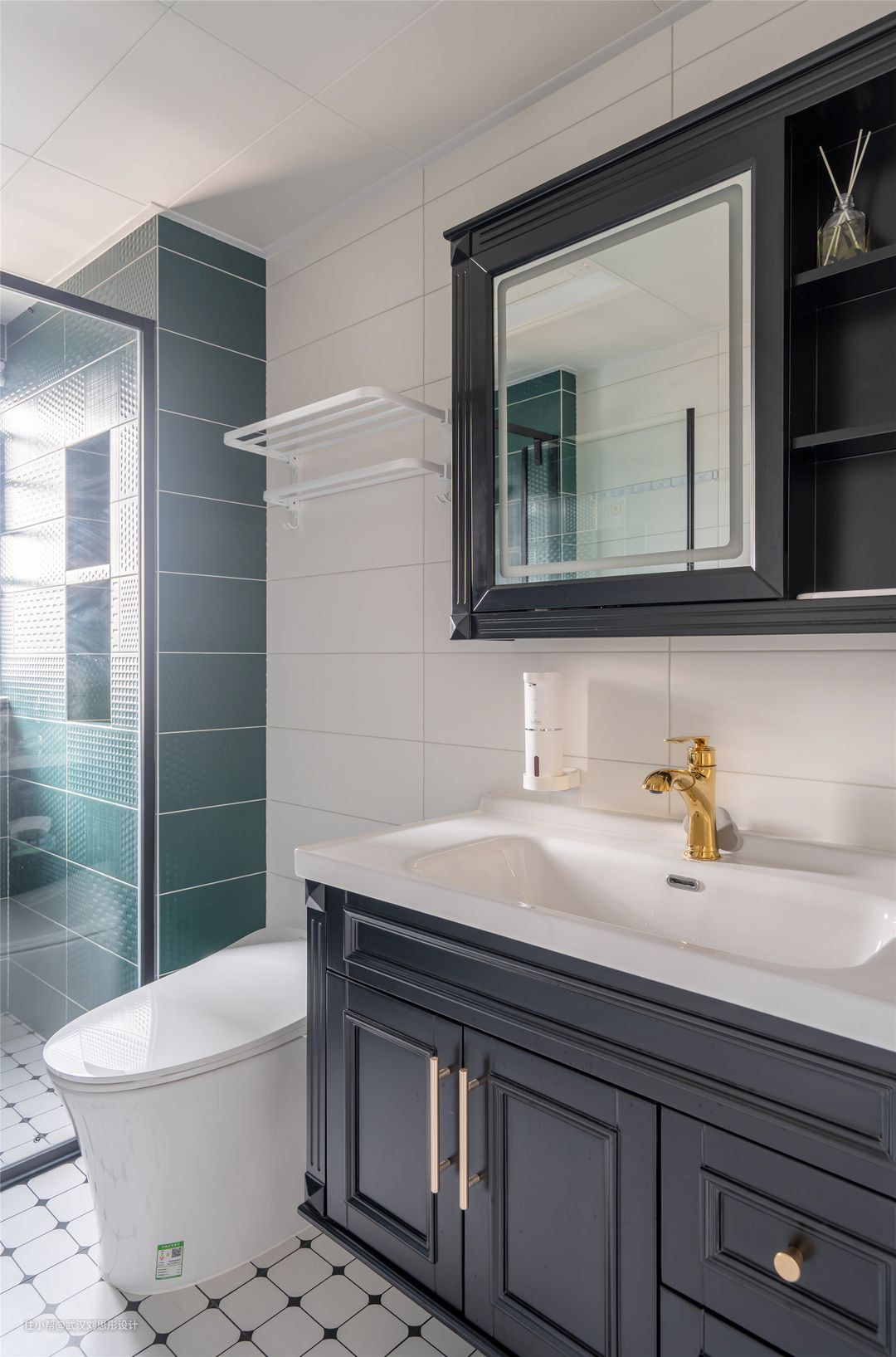卫生间墙面以墨绿色+白色瓷砖为主,淋浴区嵌入壁龛,实用的同时更有格调。