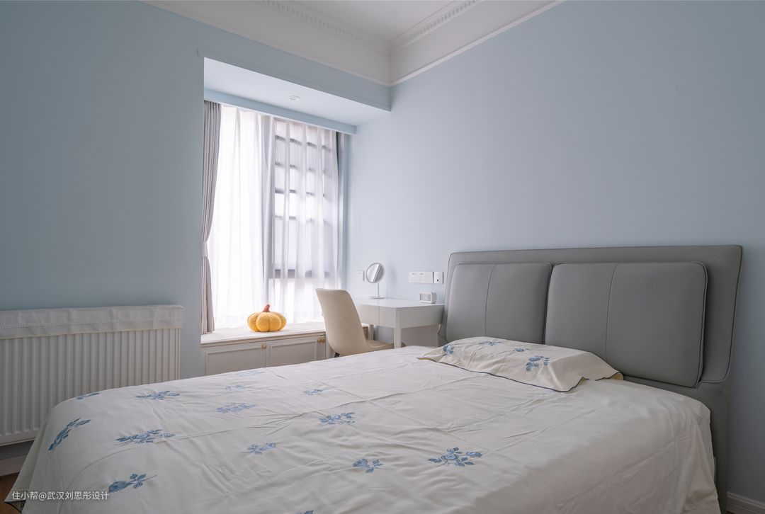 墙面以雅致的浅蓝色打底,同样选择立邦魔术漆小羊皮系列的“沁心冰蓝”(色号:沁心冰蓝BC0013-4),搭配柔美的白色窗帘,恰到好处的阳光轻柔地点拨舒适的白色床品,氤氲出一个女孩甜美梦幻的卧室空间。