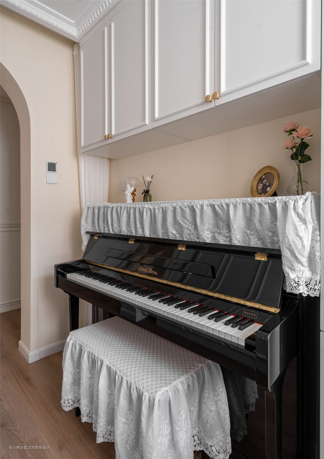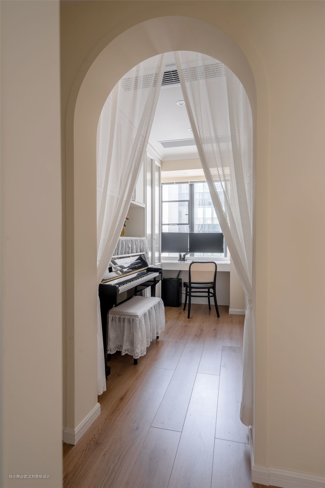 书房门采用弧形门洞+皎洁的蕾丝门帘代替,颇具仪式感,奶油色的主色调以及深邃的钢琴,以及靠窗的书桌,让整个书房温馨又精致。