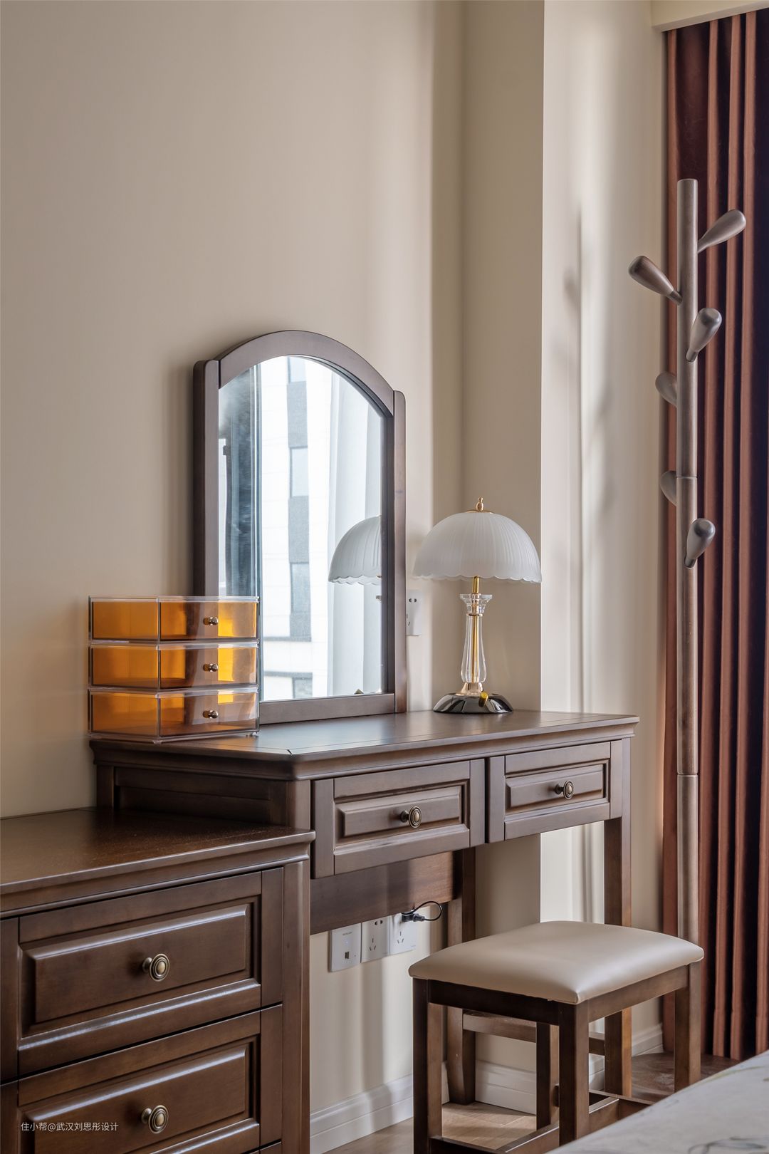 主卧延续复古的风格,也同样涂刷立邦魔术漆小羊皮系列的“荷兰乳酪”(荷兰乳酪NN3401-4),搭配深棕色枕头、同色床头柜,以及古铜金的床头壁灯,整体低调而优雅。床头背景墙用PU线作为装饰点,增加视觉效果的层次感。