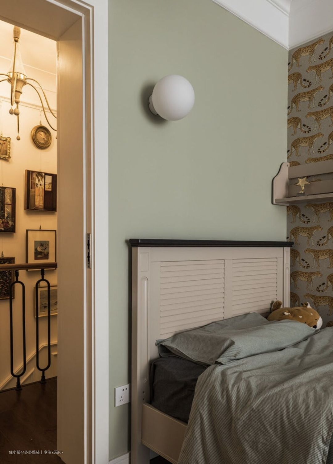 儿童房墙面主题色是牛油果色,原本衣柜颜色和涂料颜色一致但是工厂那边搞错了,颜色深了很多,将错就错小盆友也很喜欢所以就保留了,多了一个颜色层次感。整体家具也是暖米色调,搭配cole&son的豹子墙纸彰显趣味性。儿童房灯具也选用圆形和云朵造型相对柔和温暖。