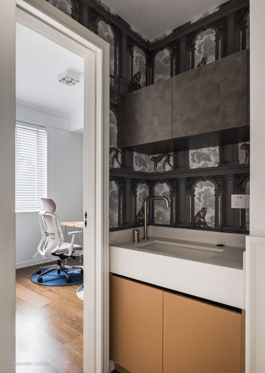 走廊尽头书房门外配置的茶水柜,工作繁忙之时也要记得多喝水,设备阳台 兼备功能和美观一体,防水防晒的铝合金柜子造型丰满充实。