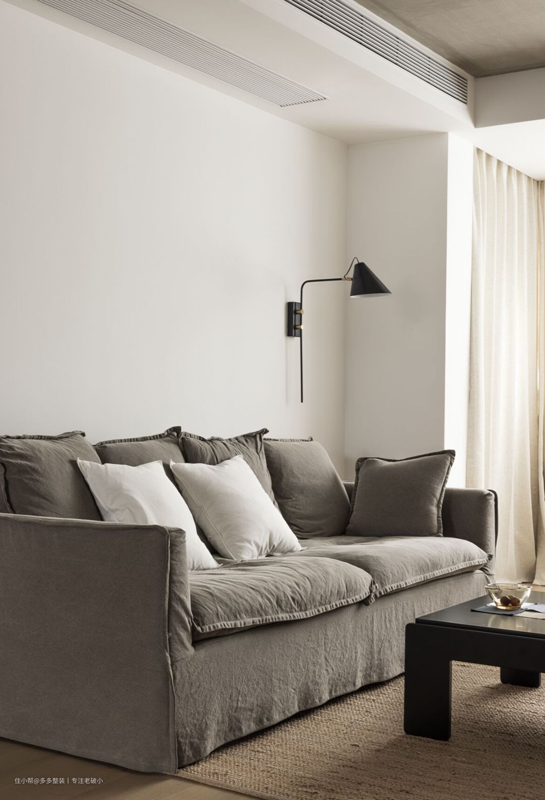 客厅作为活动的高频区,抛开繁复的设计思路,用最简单的涂料做装饰。 利用吊顶和墙体的走向,我在电视墙底部用砖砌了一条高200mm的矮墙,做成一个框体形式,将电视背景墙内嵌其中,然后将顶和 电视墙用水泥漆点缀,增加肌理感。