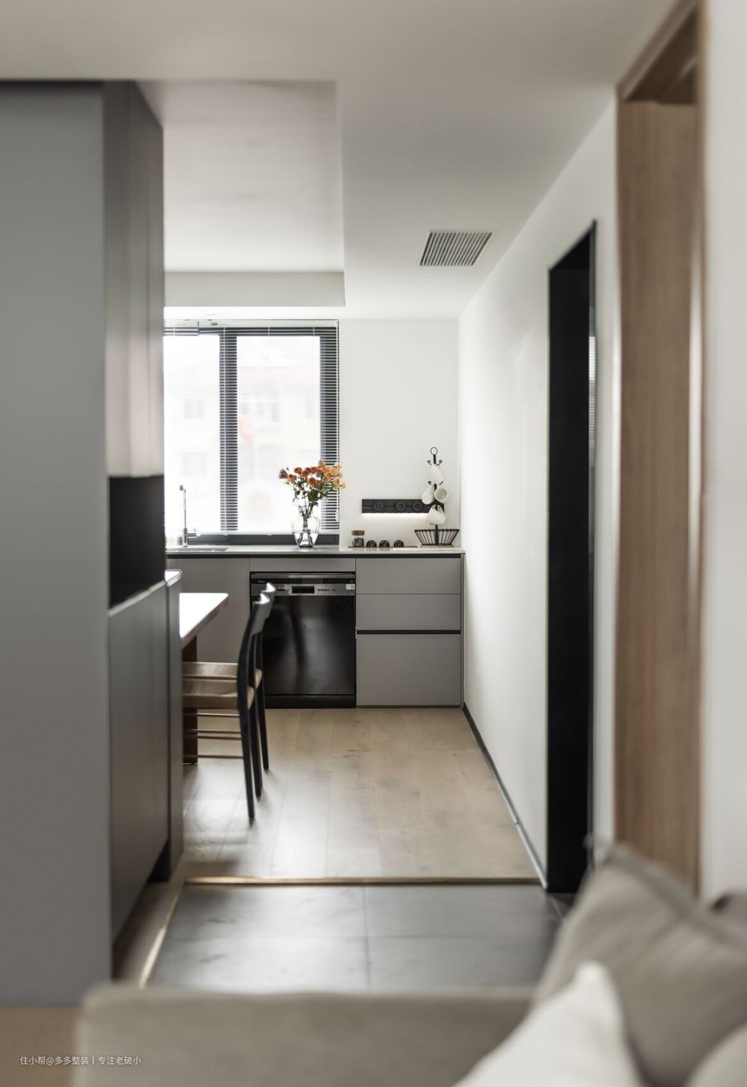 在梳理了空间关系和屋主需求后,我们将三房改回到两房,并将原本纵向零散的公区改成了横向交融的客餐厨一体化空间。 改动如下: ① 拆除原客厅位置的隔墙,让拥有大阳台的房间重新回到客厅C位。 ② 餐厅则顺势移至原客厅的位置,并在靠窗一侧增加西厨功能,作为厨房的补足和储物功能。 ③ 餐厅岛台与入户玄关柜结合,同时满足两个功能区的收纳,形成洄游动线。 ④ 同时改变厨房和餐厅的入口,避免入厕需要经过厕所的尴尬。此次,客餐厨和玄关就紧密连在一起,成为一个真正意义上南北通透,采光无限,功能齐备的交互空间。 ⑤ 厨卫开门位置改变后,原本作为餐厅使用的过道区域就改成了一个拥有三个大储物柜的立体空间,同时作为屋主的衣帽间和日常收纳使用。 ⑥ 在卧室和衣帽间之间开了个门洞方便屋主进出卫生间,同时也为屋主打造出一种套房的感觉。
