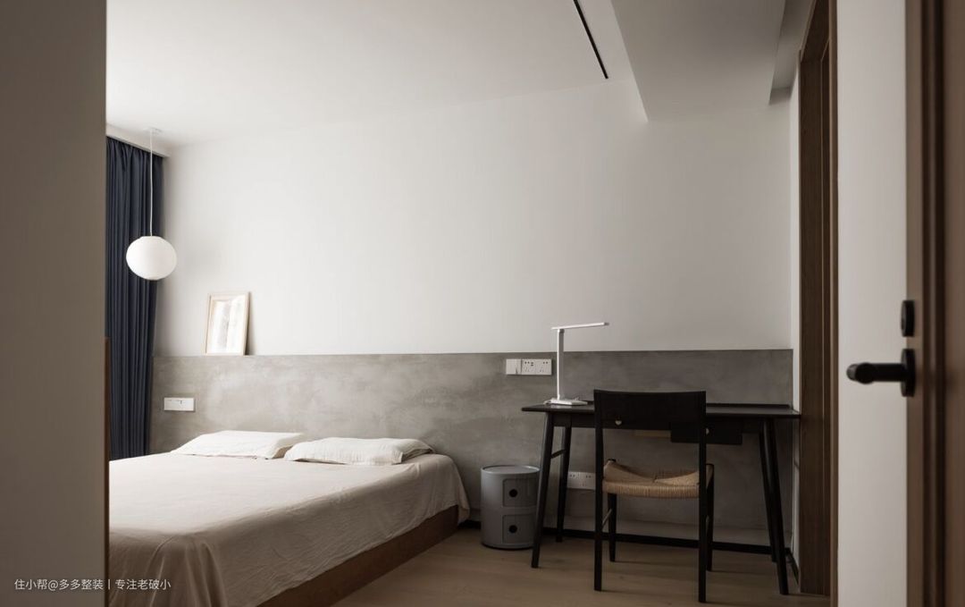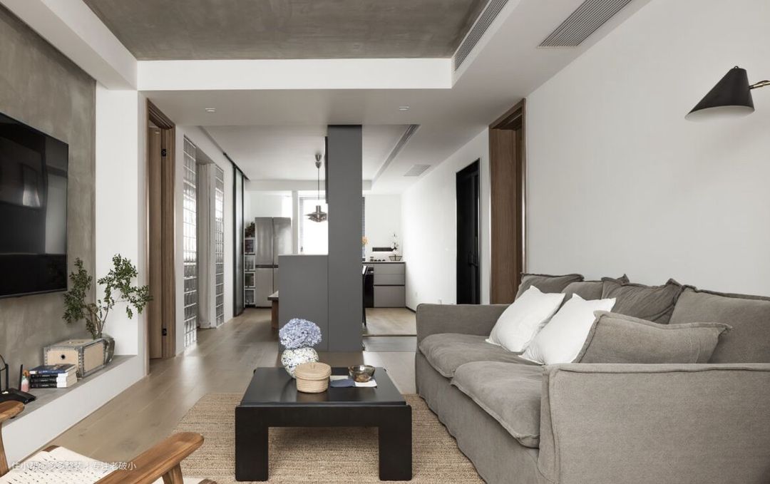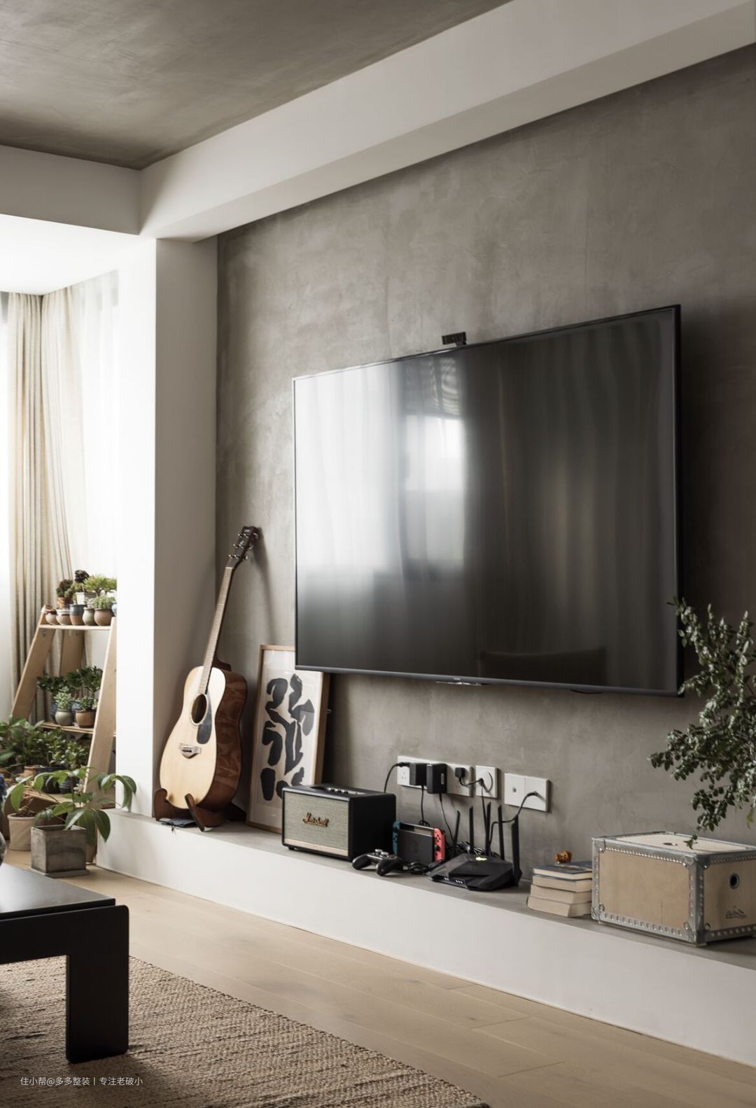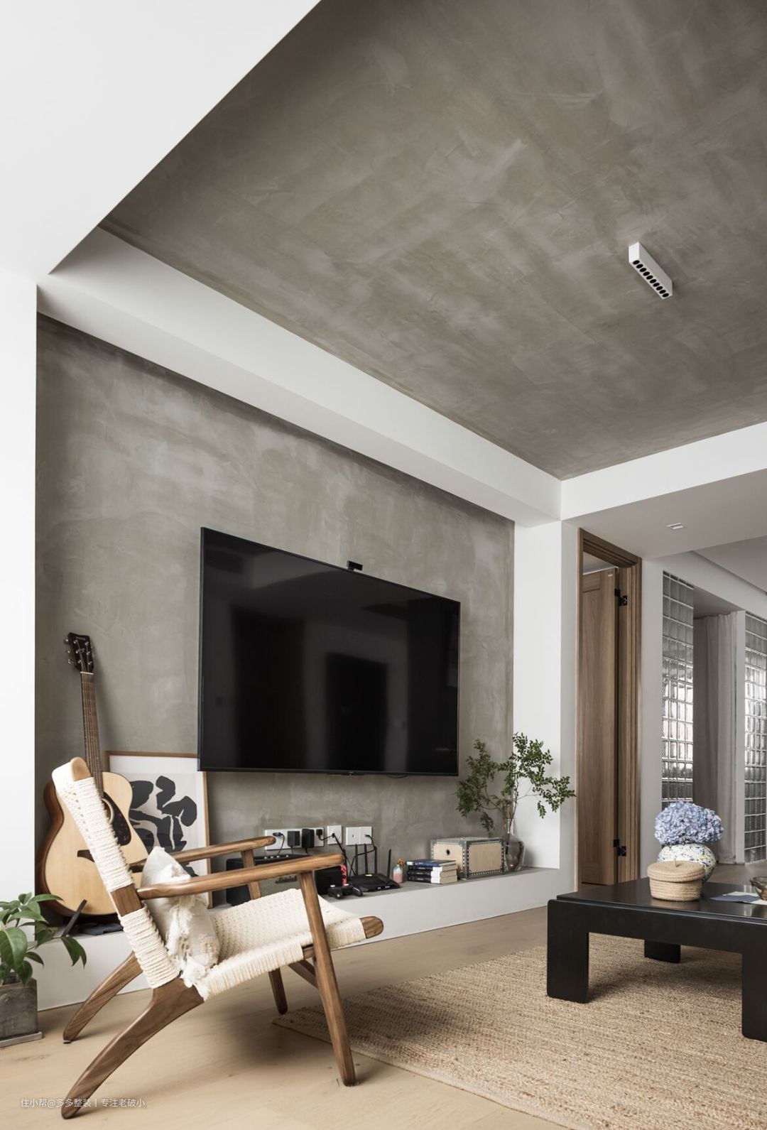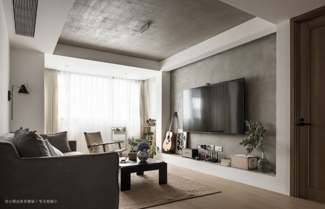 客厅作为活动的高频区,抛开繁复的设计思路,用最简单的涂料做装饰。 利用吊顶和墙体的走向,我在电视墙底部用砖砌了一条高200mm的矮墙,做成一个框体形式,将电视背景墙内嵌其中,然后将顶和 电视墙用水泥漆点缀,增加肌理感。