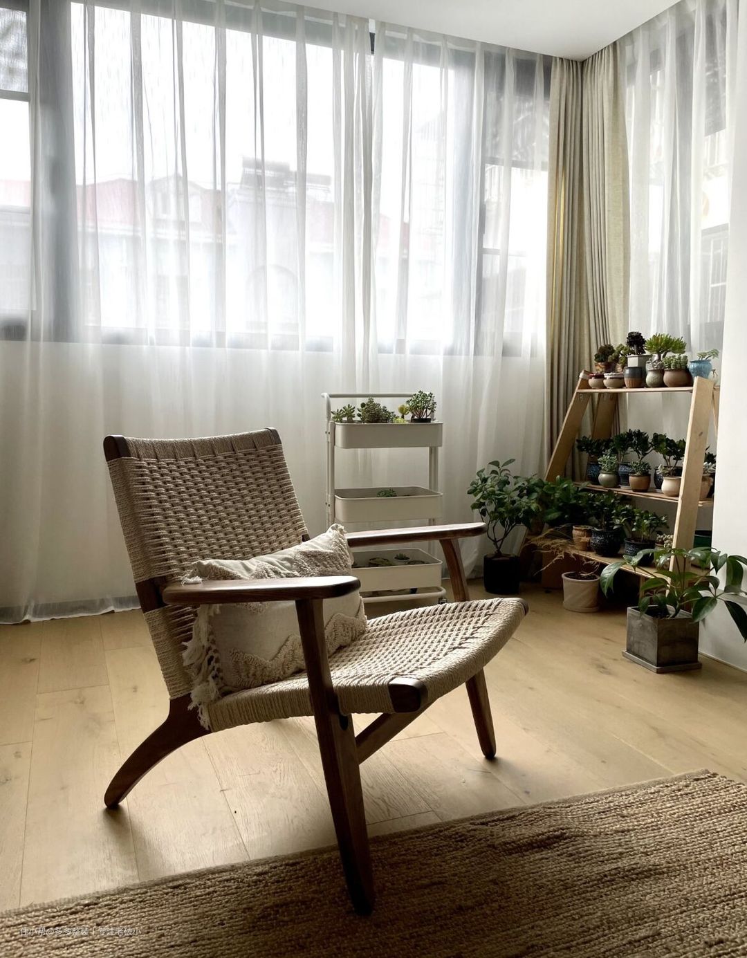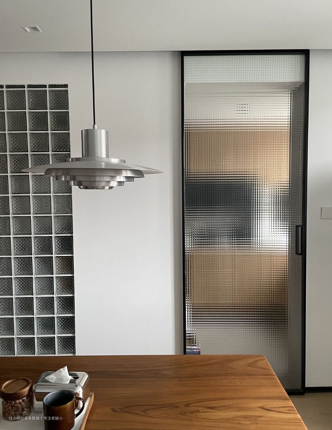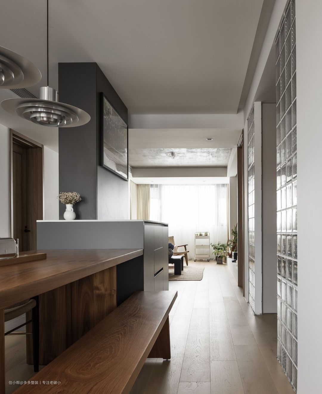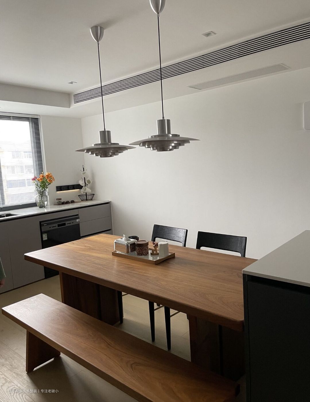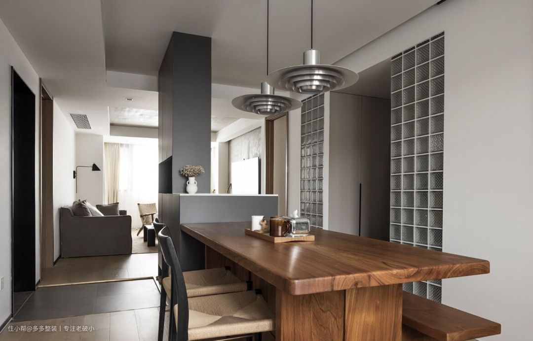 在餐椅的选择上,巧妙的选择了长凳。一来是因为它很节省空间,二来它又重现着小时候那种一起排排坐的亲密关系。