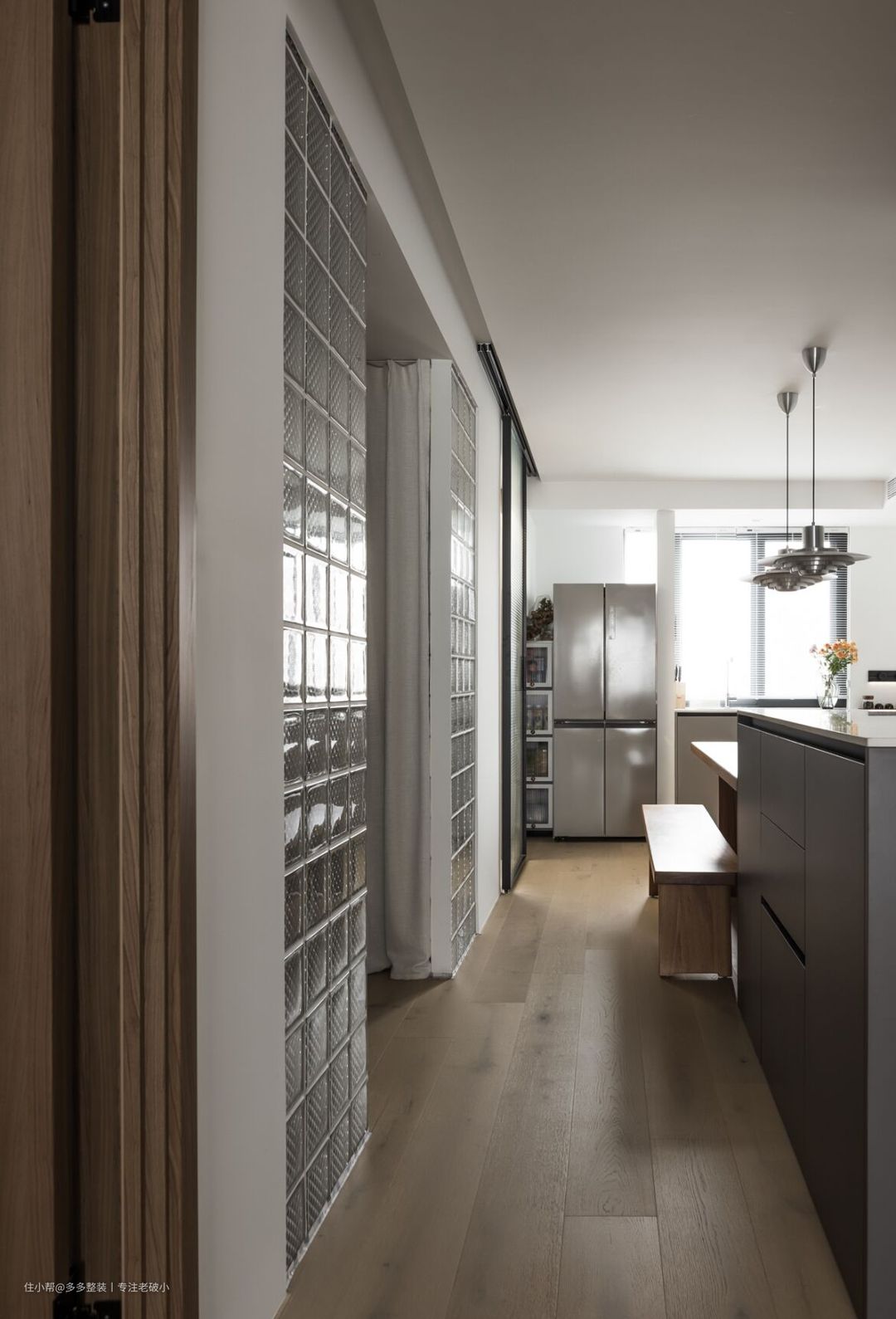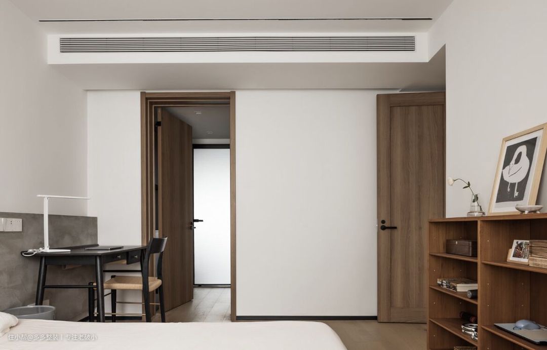 在梳理了空间关系和屋主需求后,我们将三房改回到两房,并将原本纵向零散的公区改成了横向交融的客餐厨一体化空间。 改动如下: ① 拆除原客厅位置的隔墙,让拥有大阳台的房间重新回到客厅C位。 ② 餐厅则顺势移至原客厅的位置,并在靠窗一侧增加西厨功能,作为厨房的补足和储物功能。 ③ 餐厅岛台与入户玄关柜结合,同时满足两个功能区的收纳,形成洄游动线。 ④ 同时改变厨房和餐厅的入口,避免入厕需要经过厕所的尴尬。此次,客餐厨和玄关就紧密连在一起,成为一个真正意义上南北通透,采光无限,功能齐备的交互空间。 ⑤ 厨卫开门位置改变后,原本作为餐厅使用的过道区域就改成了一个拥有三个大储物柜的立体空间,同时作为屋主的衣帽间和日常收纳使用。 ⑥ 在卧室和衣帽间之间开了个门洞方便屋主进出卫生间,同时也为屋主打造出一种套房的感觉。