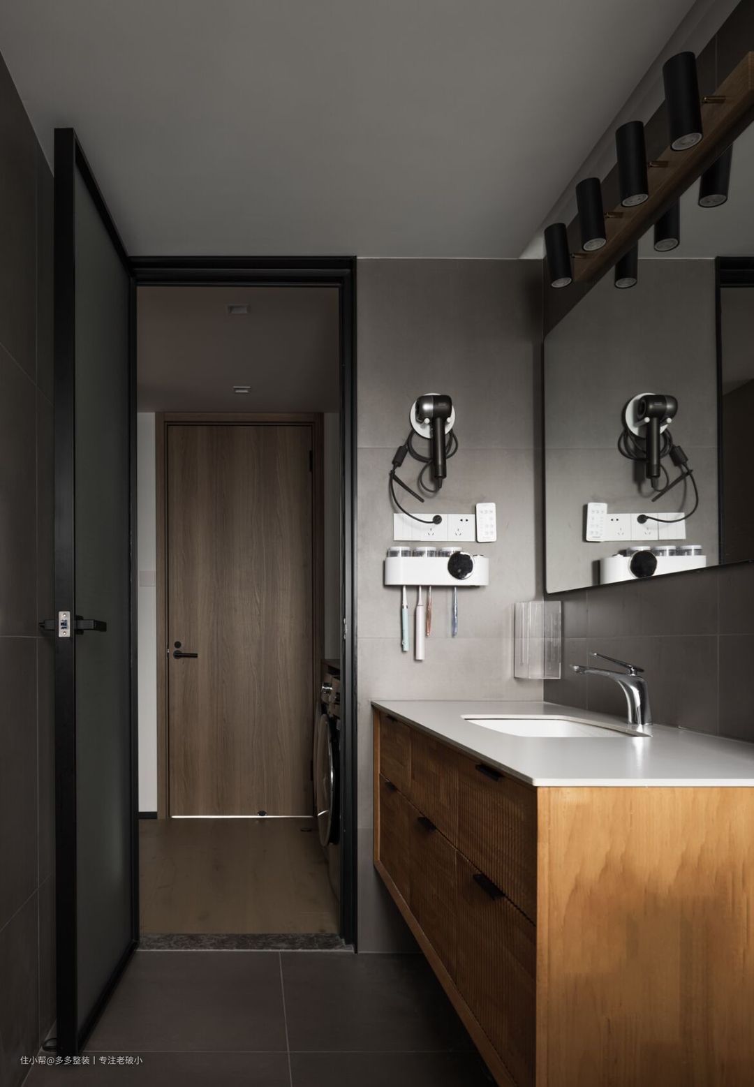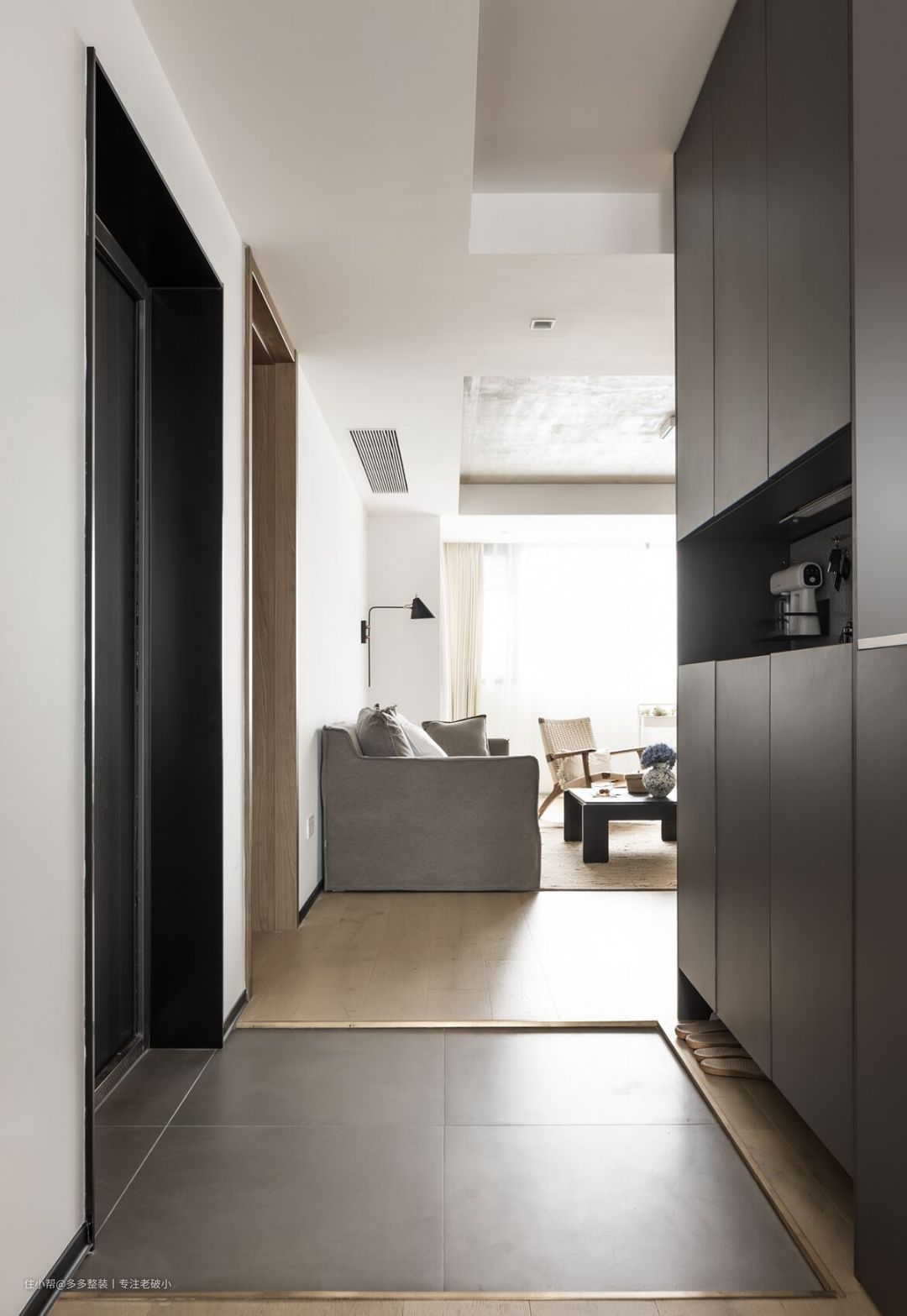 入户,左侧是客厅。 进门落尘区,铺贴中灰色地砖,方便打理,和地板之间做出的高低差通过压条收口,美观大方。 鞋柜上下分成四块收纳区: * 上柜放置平时不穿的鞋子 * 中间镂空可以防止包包车钥匙小型快递等 * 下柜放当季的鞋子 * 下口镂空,专门放拖鞋和入户鞋