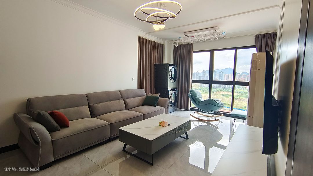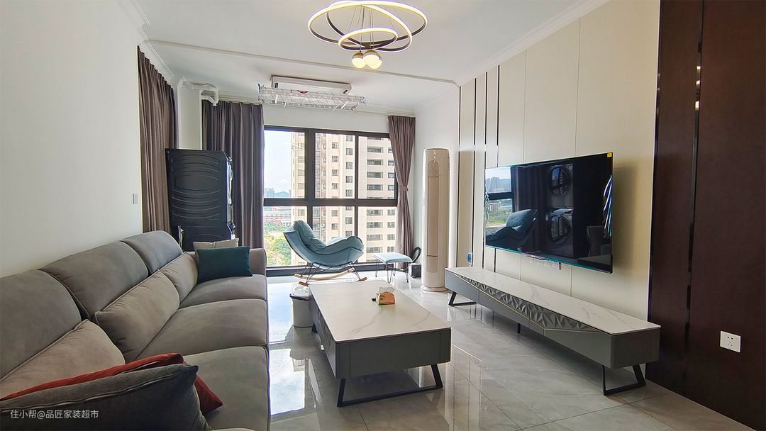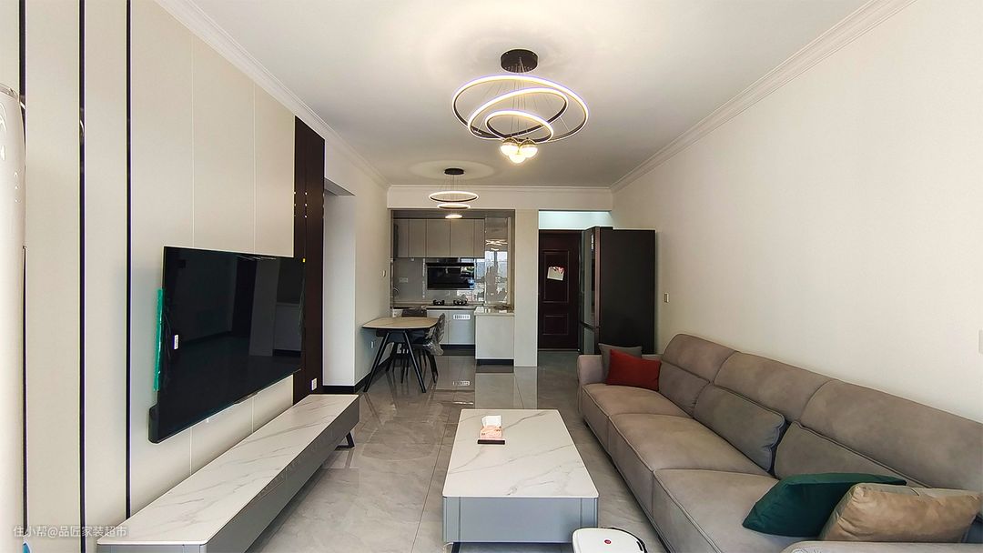 客厅采用了环形吊灯,带来的视觉感十分具有个性和美观。在电视墙的设计上,采用集成板电视背景墙,突出新潮个性,美观性价比还高。