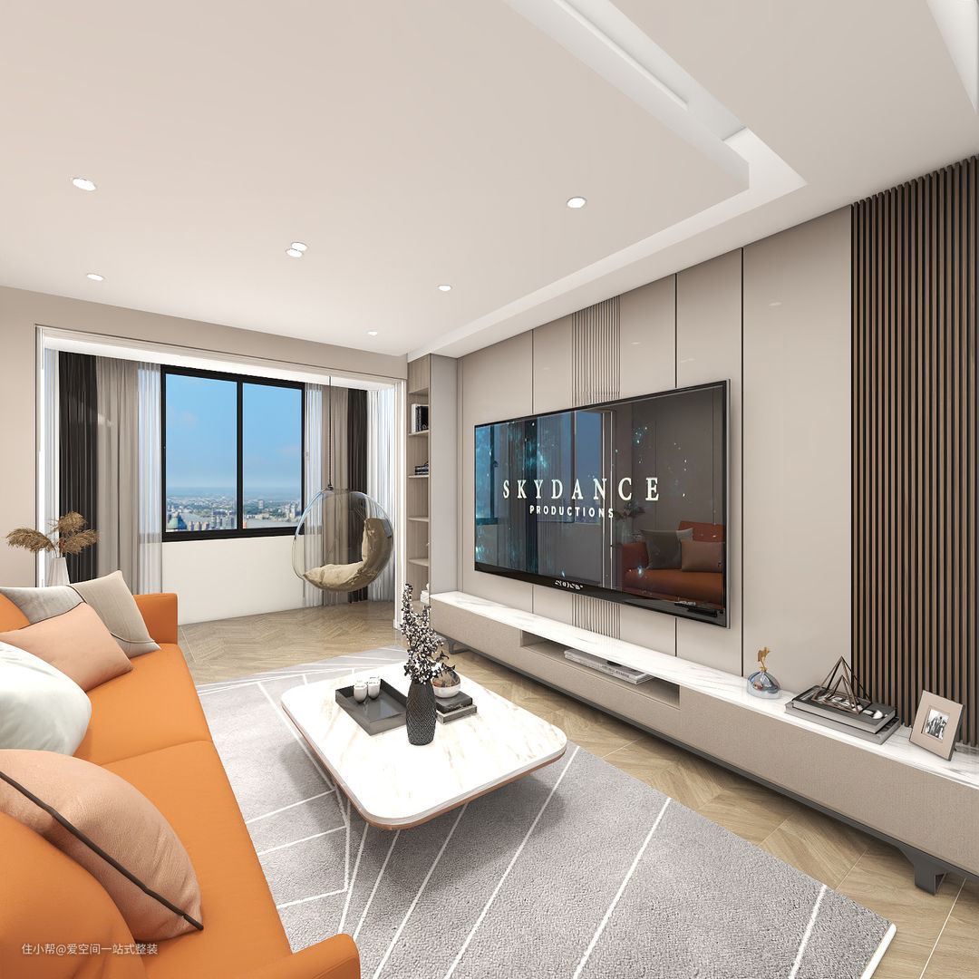 电视墙的设计十分华丽,电视柜和墙面颜色一致,搭配搭配橘色的沙发,打造的空间简约大气中还充满活力。 客厅将阳台打通,大面积的窗户让整个客厅视野变得宽敞,采光也十分充足,在窗前放一个懒人藤椅,坐在这里欣赏窗外的风景,舒适又惬意。