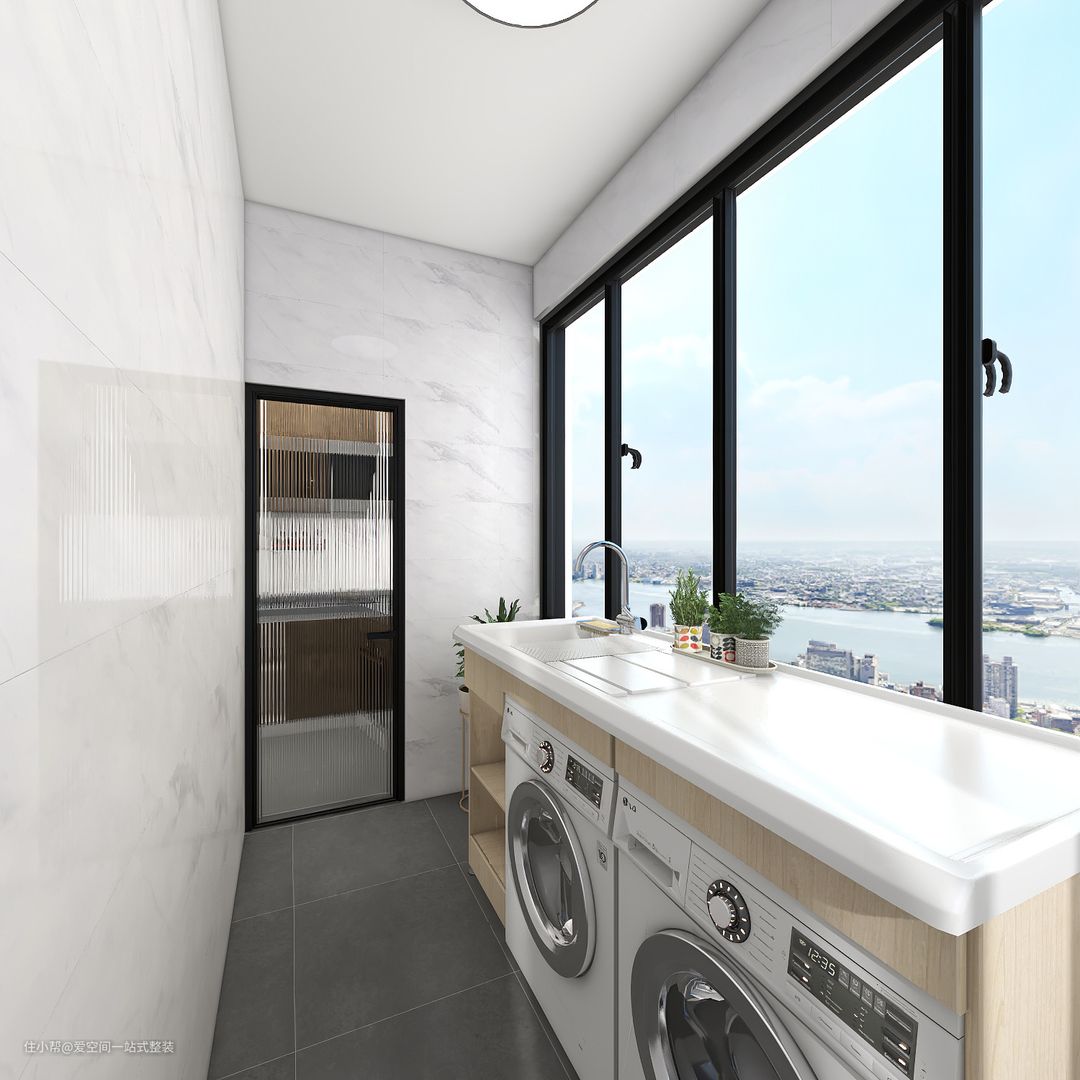 厨房带的这个阳台做成了洗衣房,洗衣机和烘干机放在这里刚刚好,平时晾晒衣服也十分方便。