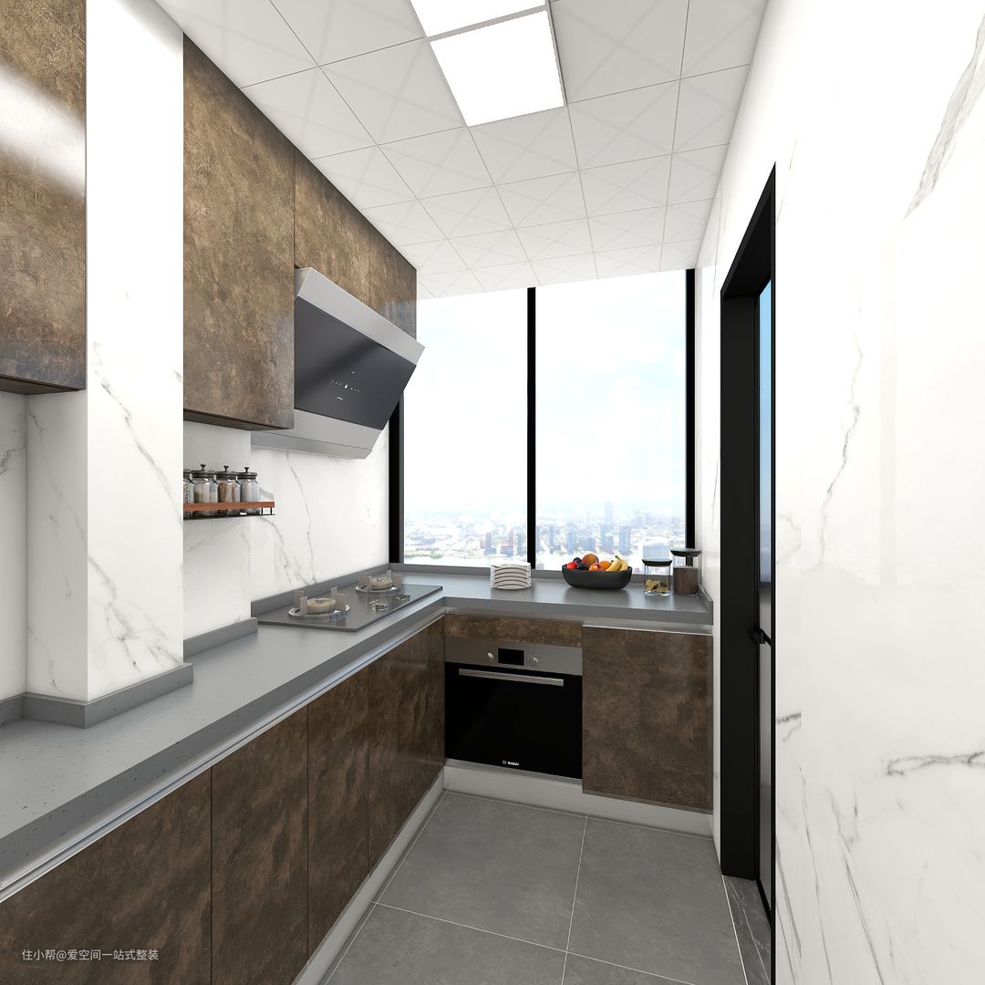 厨房的空间不大,L型的橱柜布局合理,操作起来也很方便。 墙壁上还安装了一排吊柜,增加了厨房的收纳能力,虽然布置略显拥挤,但实用性非常强,整体效果也十分不错。