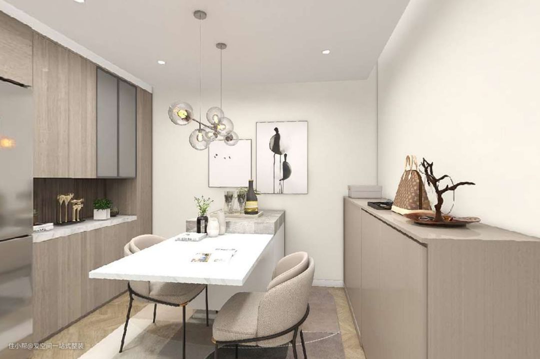餐厅是典型的餐桌+餐边柜的设计,用餐功能、收纳功能和装饰功能一应俱全。