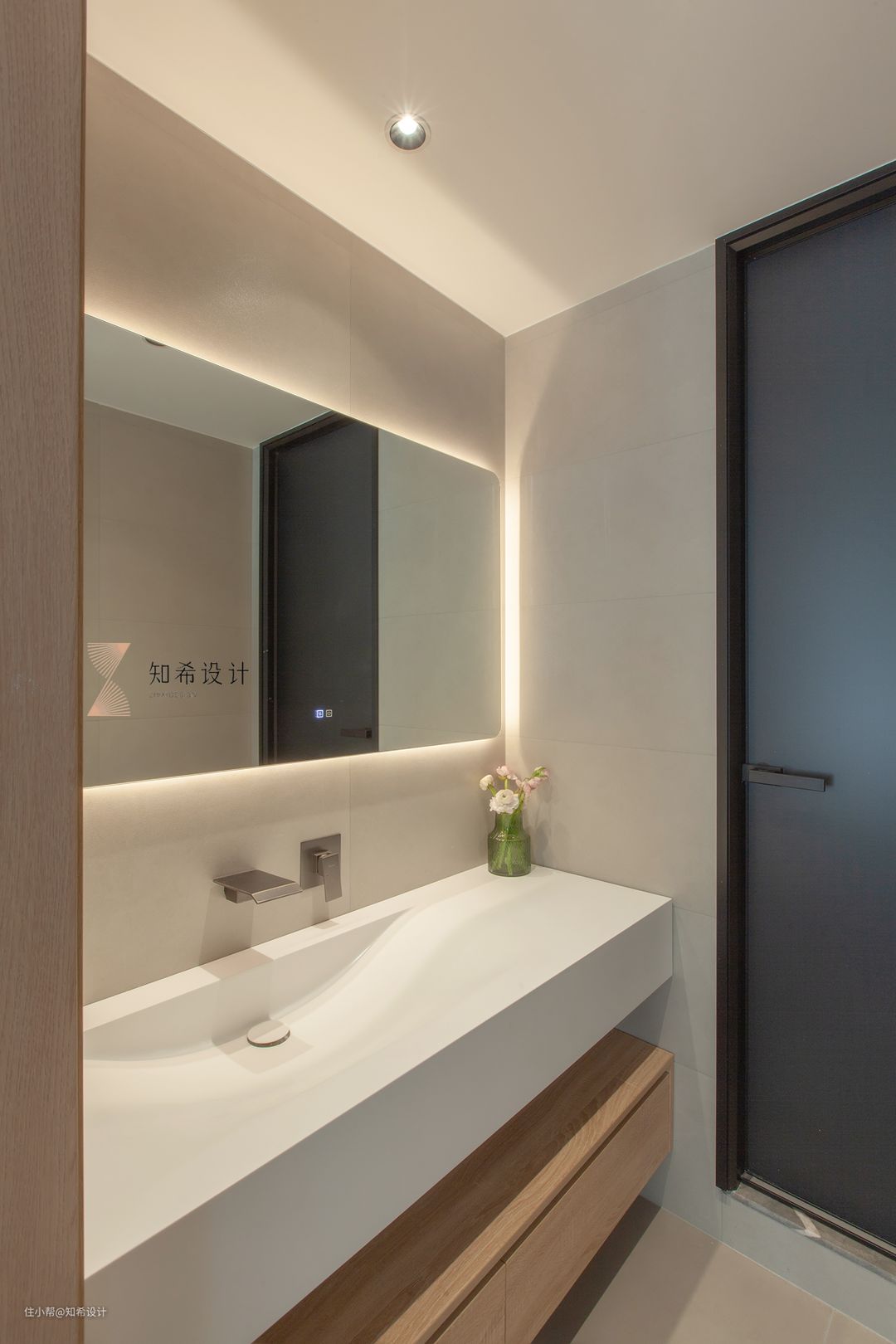 干区也是可丽耐的一体盆,搭配暗藏瀑布式水龙头,加两层抽屉式的洗手盆,整面镜的设计搭配灯光质感满满。