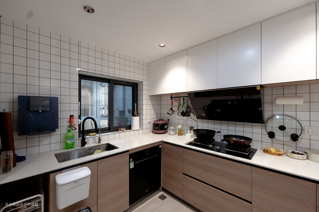 厨房中西厨结合做了U型布局,安装了美的的洗碗机,选用了方太的烟机灶具,一侧用了凯度的烤箱做了嵌入式设计。 厨房一侧留出90cm冰箱做了嵌入式的设计,选用了美的四开门的冰箱,地柜做了抽屉设计,收纳利用率高。厨房不只一盏灯,在台面上方加了筒灯照明,便于操作。
