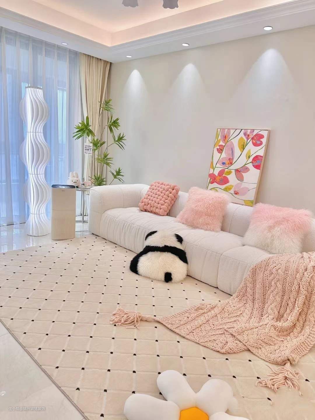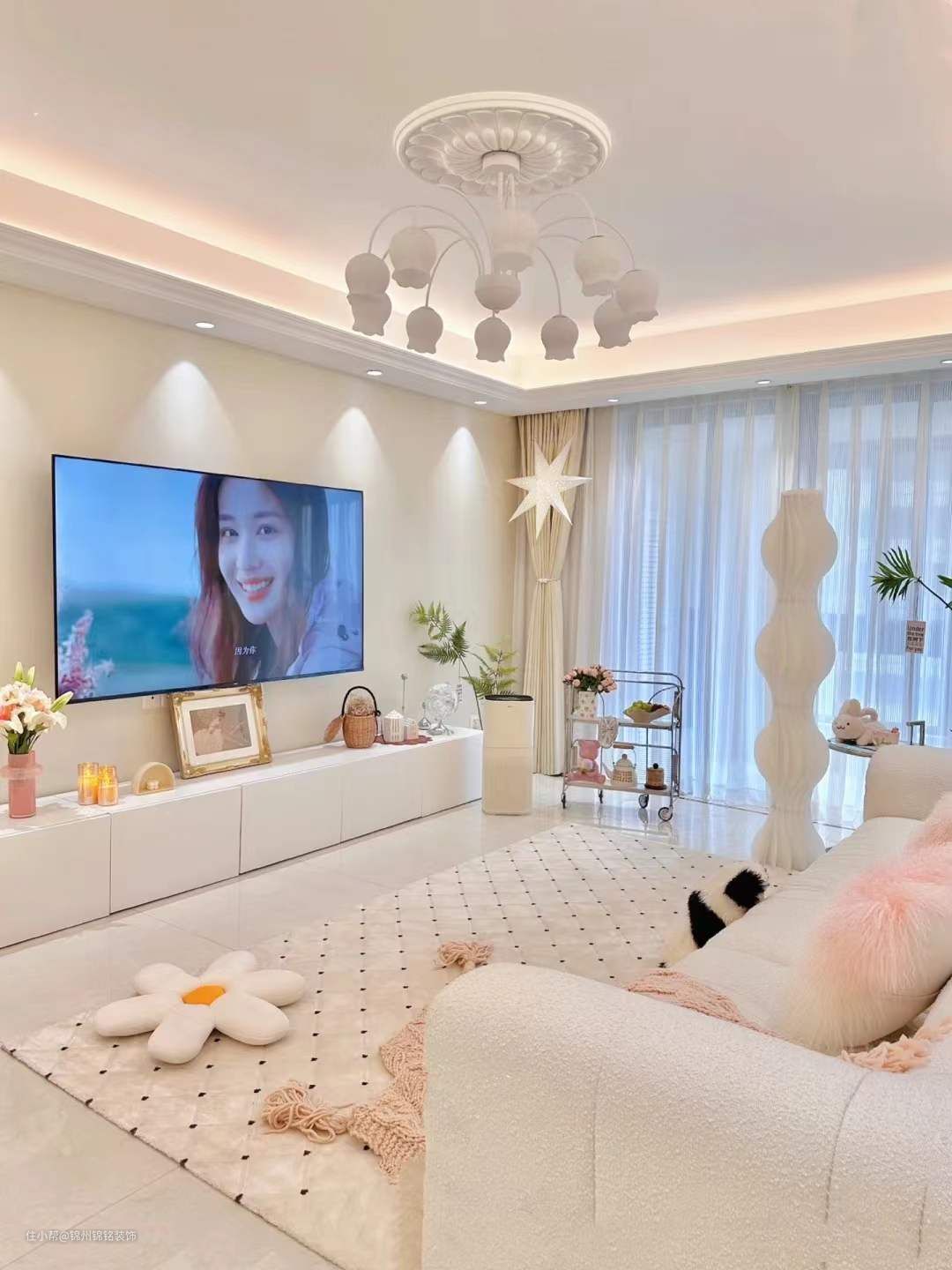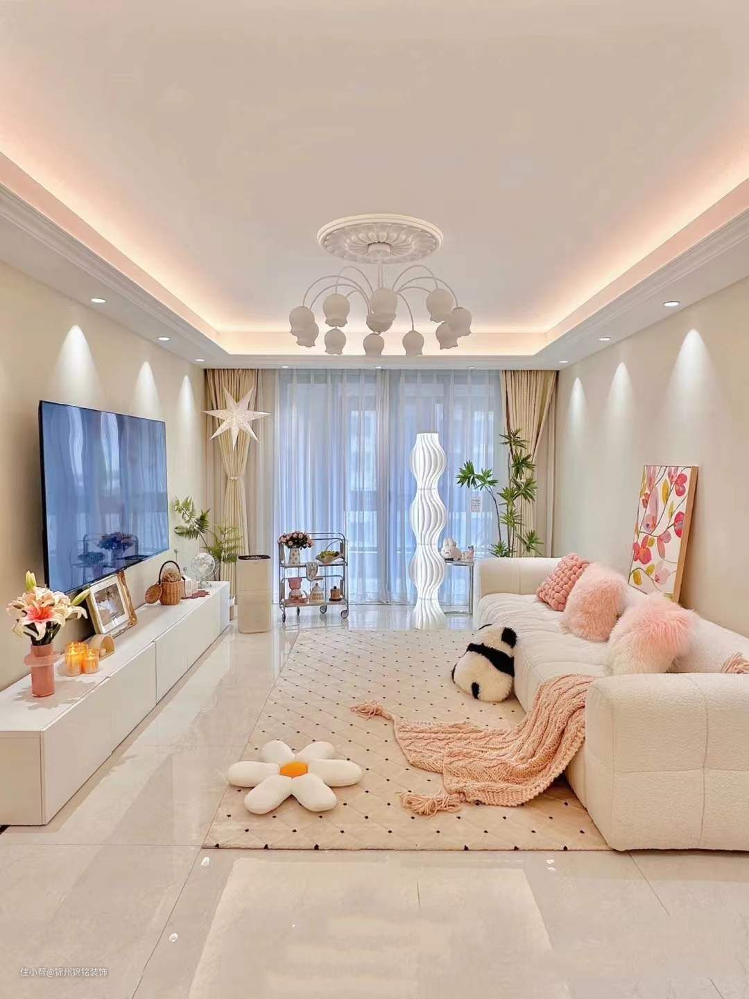 轻硬装重软装,没做复杂电视,沙发背景墙,简单白墙+米色墙布,简约又大气。客厅回形灯槽吊顶,四周暗装射灯,绝美小山丘洗墙,4000k暖白光打在米色墙布上,氛围感满满。奶油蛋糕沙发搭配柔软舒适的简约奶油地毯,同色系的搭配显得好看又温柔。