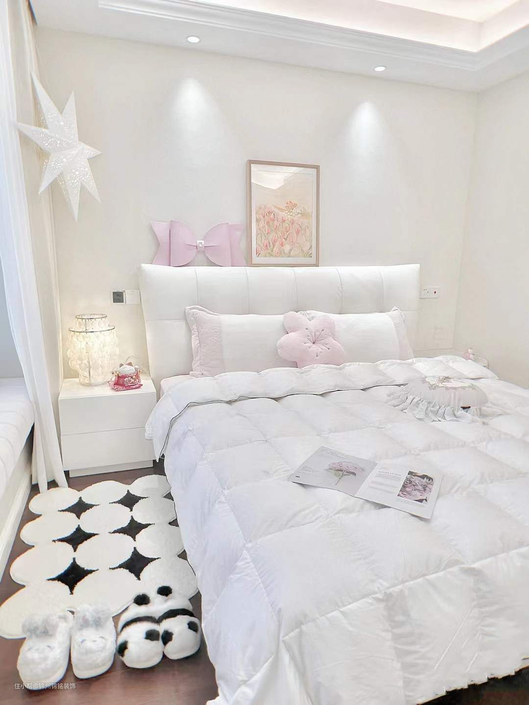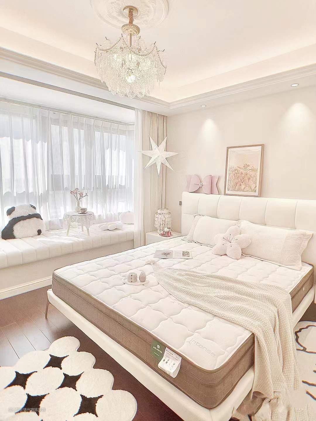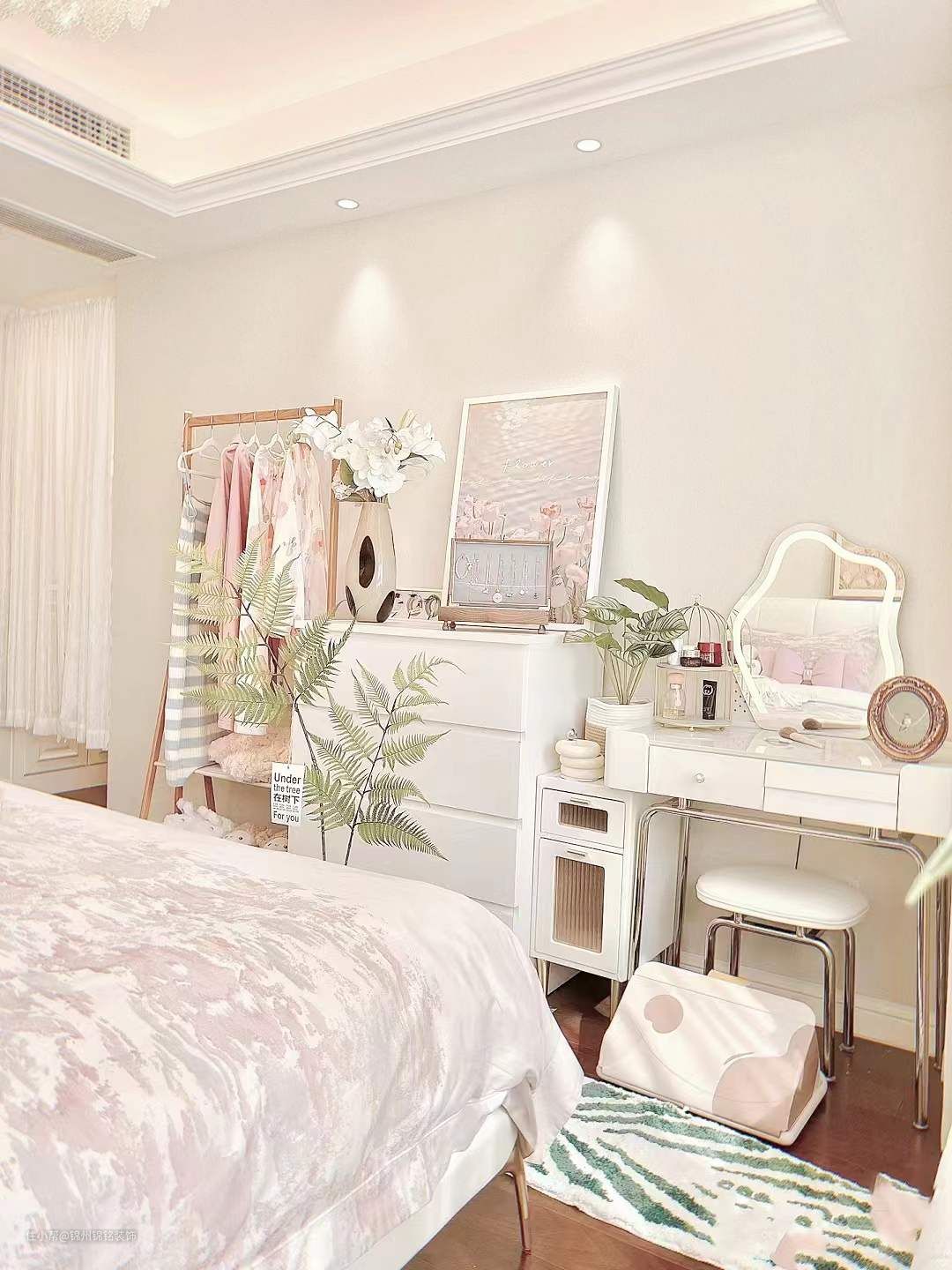 卧室,羽毛白床搭配高级舒适的奶白床品,氛围感满满的羽毛吊灯,床尾简约百搭梳妆台及斗柜,落地衣架挂常穿的衣物,唯有喜爱能抵岁月漫长。