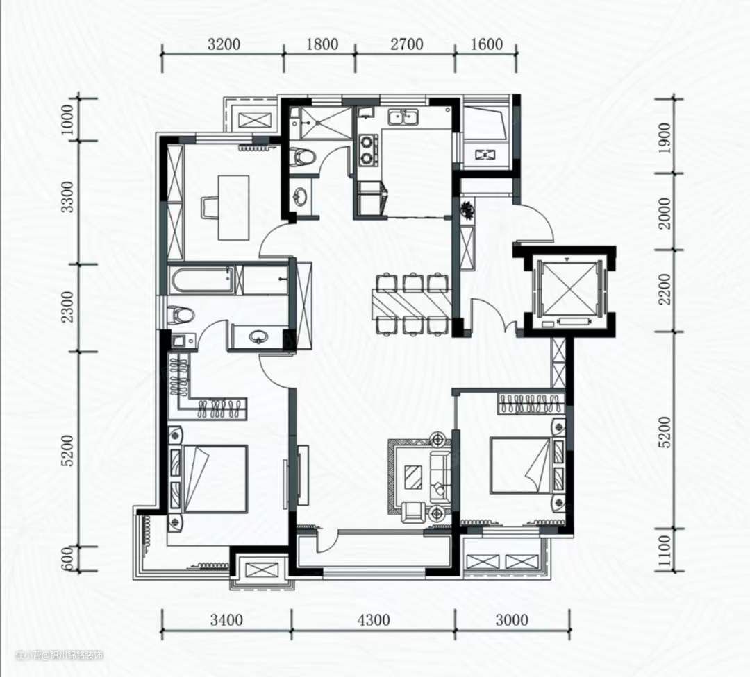 屋主是一对年轻的情侣,打算在今年完婚, 交房后就开始着手寻找合适的设计公司,所以这是一套承载着业主对未来生活期待的婚房。女业主是一个很有想法的人,她希望她的家可以美丽又实用,整个装修下来基本上都是自己做的决定,父母没有插手,老公也很支持。 原始户型:这是一套面积124平方米,三室两厅的户型,原始布局还算规整,所以我们在户型改造上没有做过。多调整,重新规划布局了客卫、走廊以及两间,卧室的空间布局,在更契合业主生活方式、提升居住使用感的基础上,巧妙增加了一定的收纳空间。