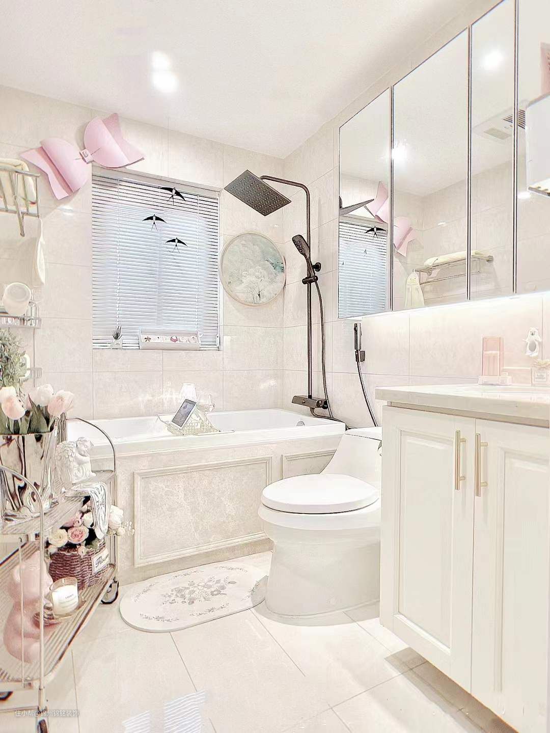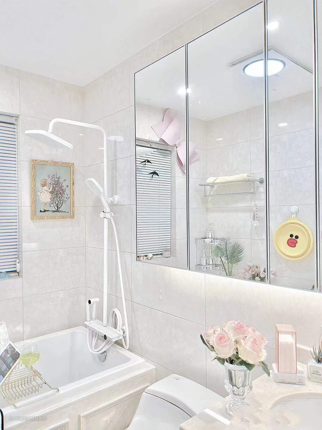浴室好看的关键是整洁干净,浴室小东西多,镜柜大大增加垂直收纳空间,搭配一些分区收纳盒,护肤品放置一目了然,拿取方便。自带镜前灯氛围感满满,镜柜注意底部留空距离,大于26cm,台面可以放置日常洗手液等物品。