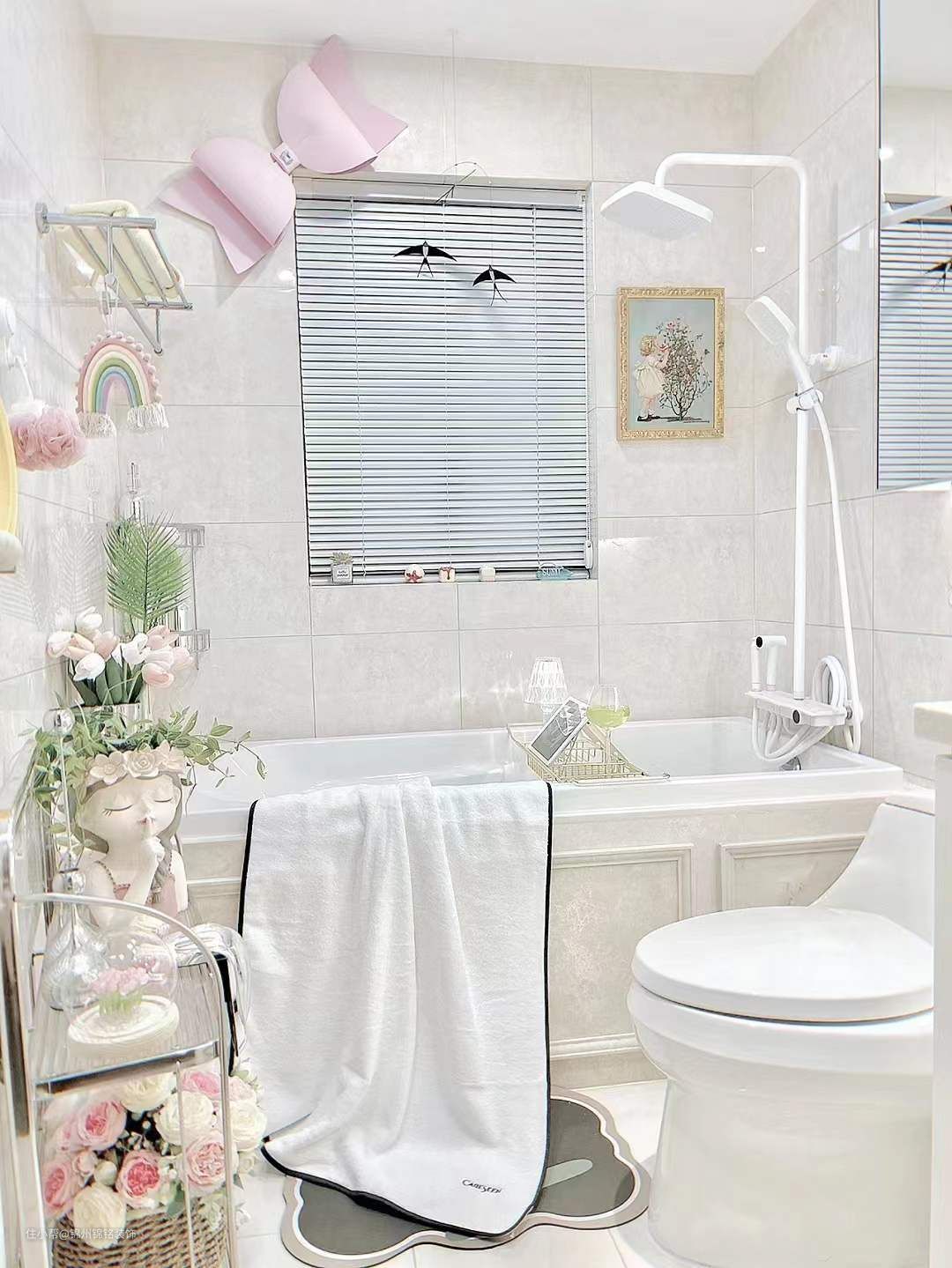 高颜值白色恒温花洒与浴室很搭,钢琴按键很有质感,星空大顶喷出水绵密,手持花洒有三种模式, 满足 日常洗漱需求。地面铺上铺上一块防滑耐脏的复古绿花朵地垫,墙面安装了置物架放置洗浴用品及毛巾类物品,门后拖把架挂拖把类用品,免打孔挂钩挂置可折叠盆及常用物品。