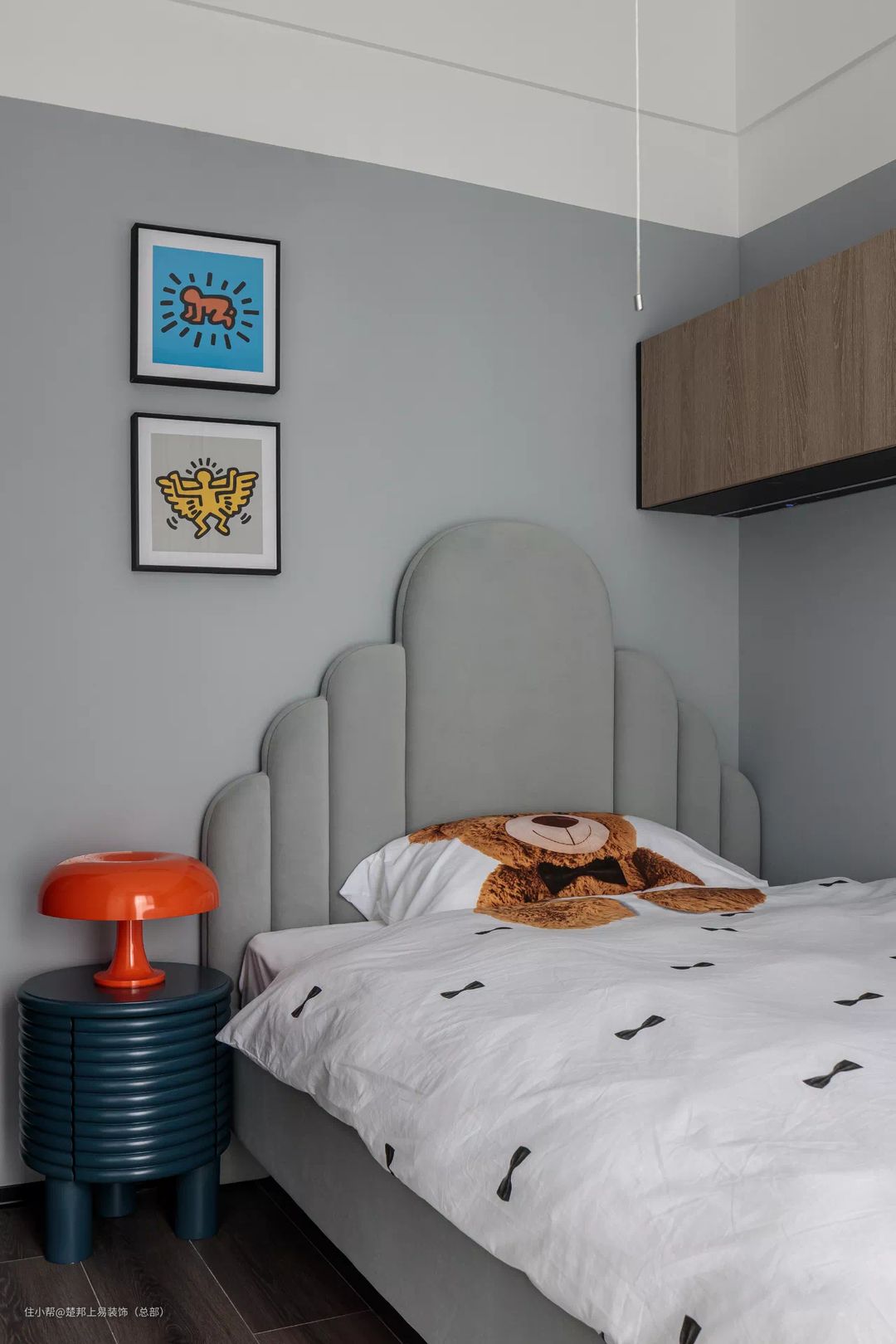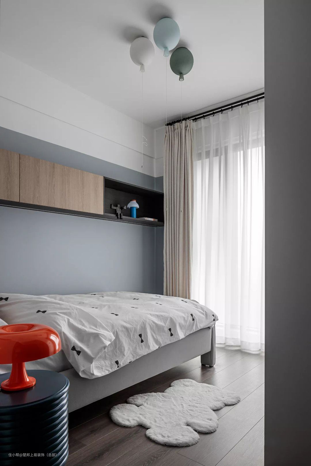 次卧作为儿童房,融入了很多童趣的元素,山峰造型的床头,可爱的挂画,气球造型的吊灯,满满的童真,墙面的悬挂柜,可以将孩子的书籍玩具收纳进去,增加收纳空间~