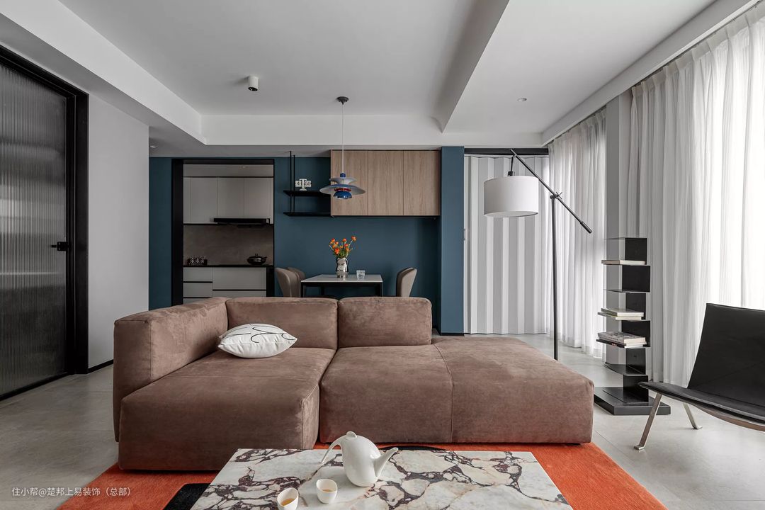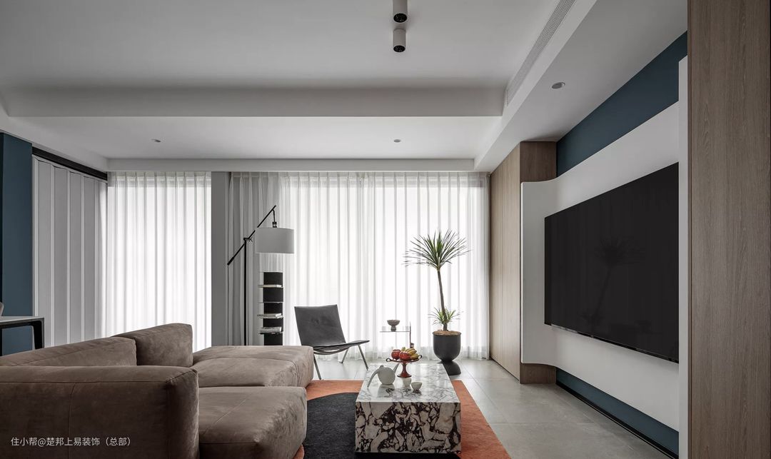 客厅选用墨蓝色搭配白色的几何造型做电视背景墙,更有层次感,旁边做了一个通顶柜,增加客厅收纳空间,棕色布艺沙发营造出舒适感,超大落地窗增加了室内的采光~