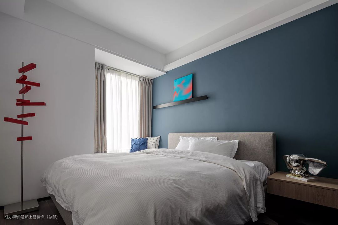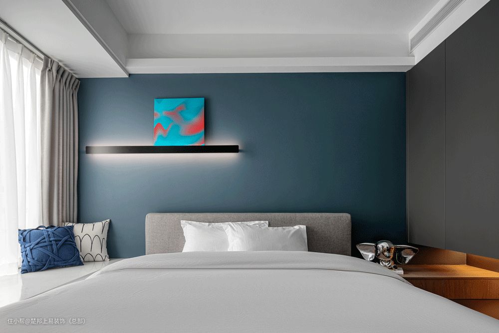 主卧沿用了客厅的墨蓝色,悬空的床头柜和衣柜,节省空间的同时也营造出了高级感,飘窗也完美利用起来,可以摆放抱枕等,结合超大飘窗更显惬意~