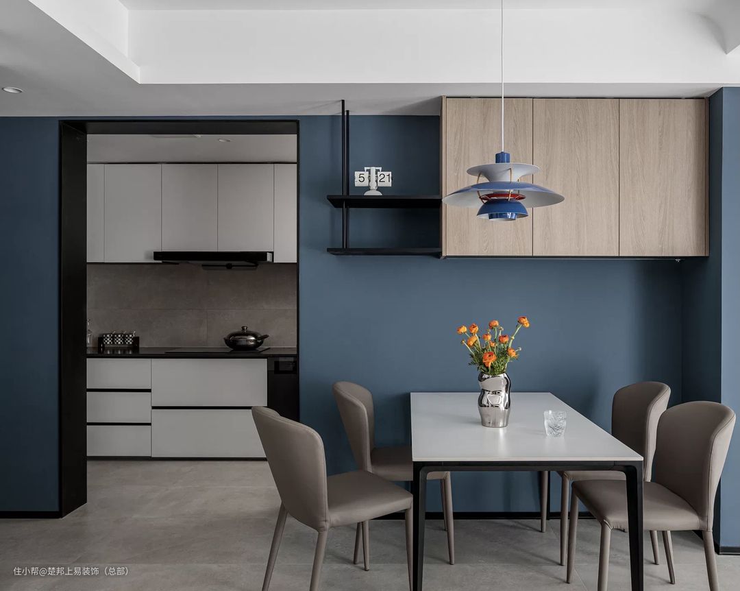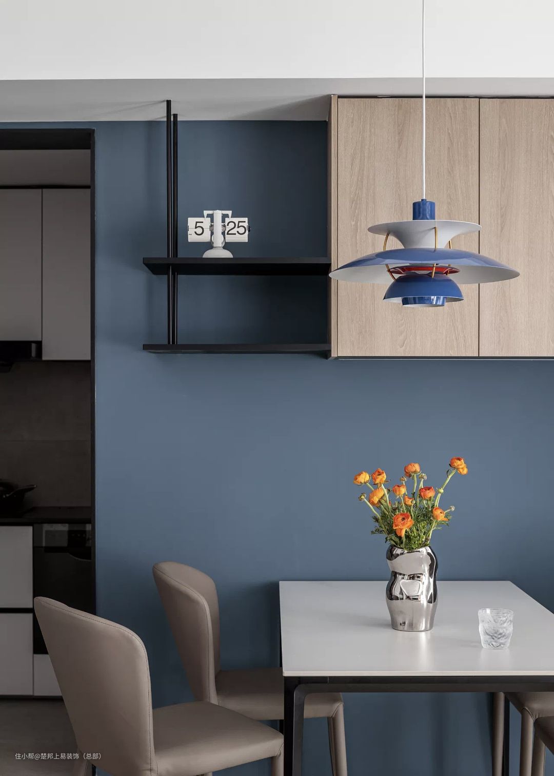 餐厅也是以墨蓝色为主,吊灯也选用蓝色,和墙面颜色相互呼应,餐桌上发做了吊柜,增加了餐厅的收纳空间~