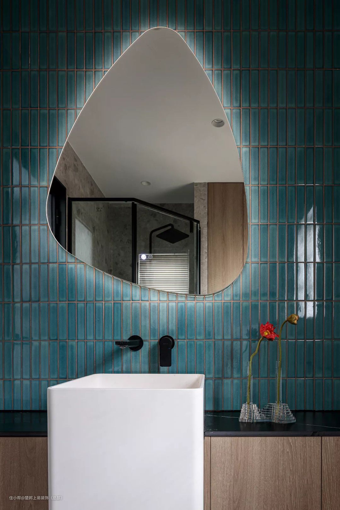 卫生间不规则形状的镜面,增添了一丝艺术感,绿色的马赛克墙砖恰到好处,室内也不会显得沉闷,干湿分区的设计,防止了用水飞溅,也方便打扫~