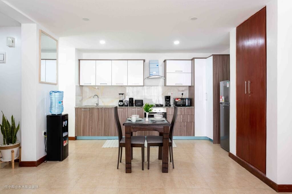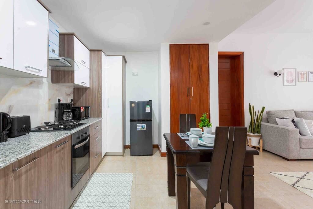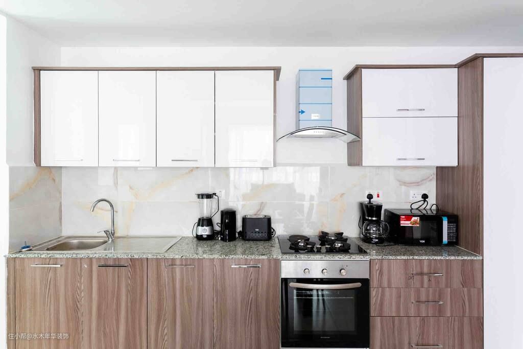 厨房没有复杂的设计,一字型布局动线清晰,视觉上也显得简洁明快。白色吊柜搭配胡桃木的地柜,整个厨呈现出一简单的高级感。部分柜体做成抽屉式设计,收纳物品更加便捷高效。