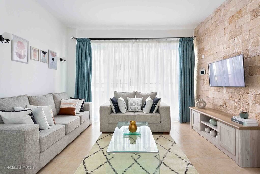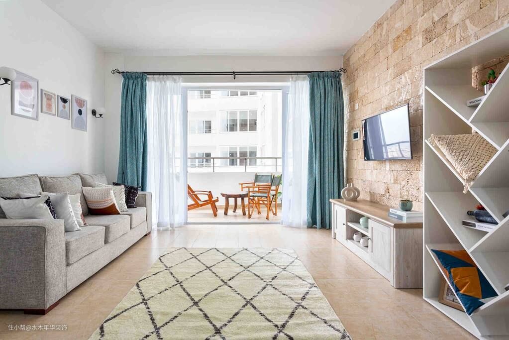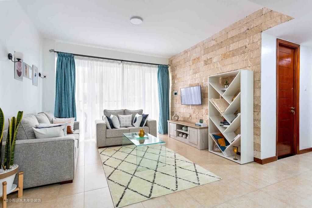 客厅的设计比较简约温馨,暖色调的背景墙搭配浅棕色的瓷砖,色系干净,简单又不失温馨。窗帘选用了湖蓝色,在浅色系的空间一下捕捉了人的眼球很吸睛,而且小面积的点缀,在白色和灰色的背景空间里不会显得过于繁杂,反而呈现出一种优雅精致的氛围感。可客厅空间统一采用无主灯加大平顶设计,起到拉伸空间的作用,在一侧落地窗引入的光线的映衬下,更显宽敞明亮。 客厅电视柜一侧定制了白色储物柜,白色的失眠显得干净又整体,其中做了斜角式设计,增加层次感,放入书籍摆件,有一种独特的艺术美感和设计感。