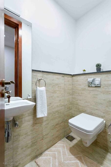 卫生间墙面选用半墙板设计,赋予空间层次感,悬浮式马桶,不仅制造空间的轻盈感,而且因为是垂直悬浮地面的状态,不容易藏污纳垢,而且360°无清洁障碍,日常清理更省心。