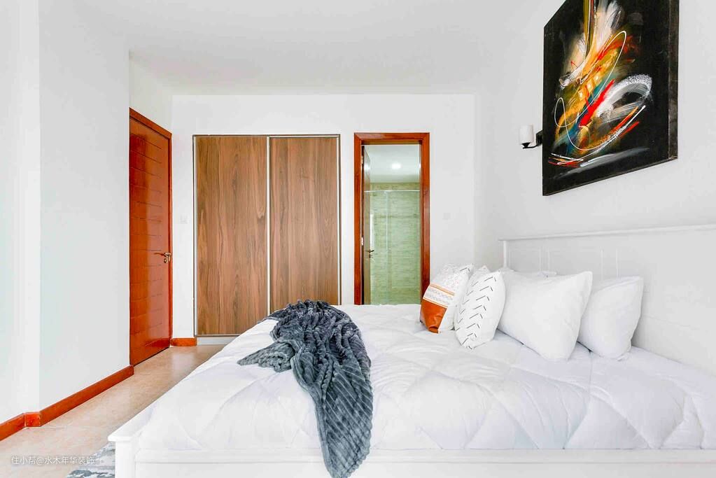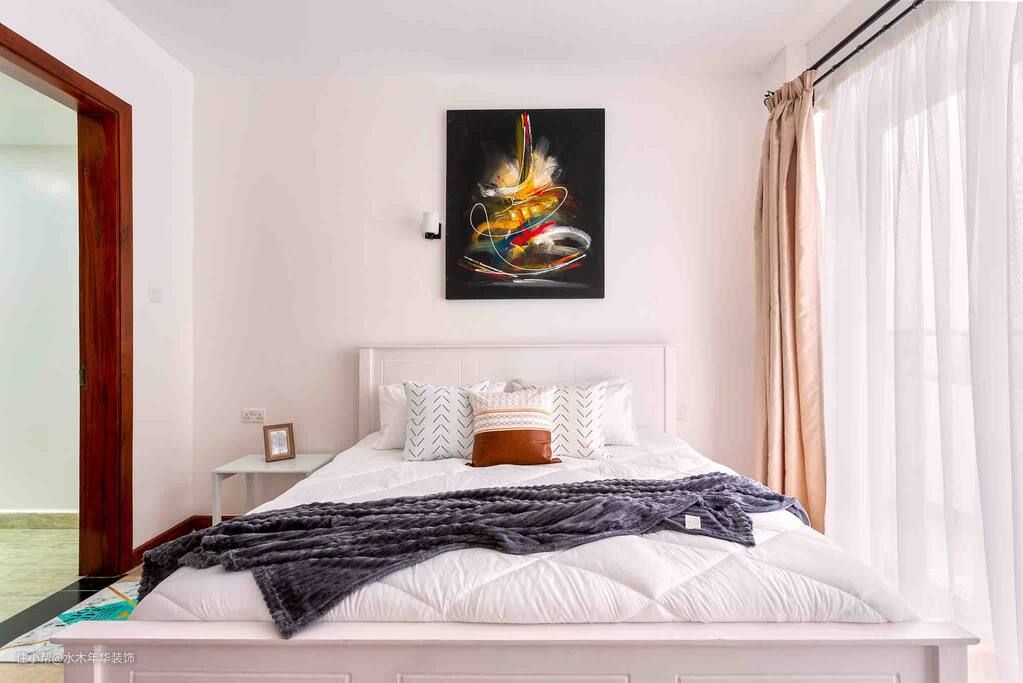 主卧的色调以白色为主色调,搭配粉色,黑色和焦糖色元素,营造空间的层次感,窗帘选用温柔的粉色系,整个空间色彩丰富且不杂乱。
