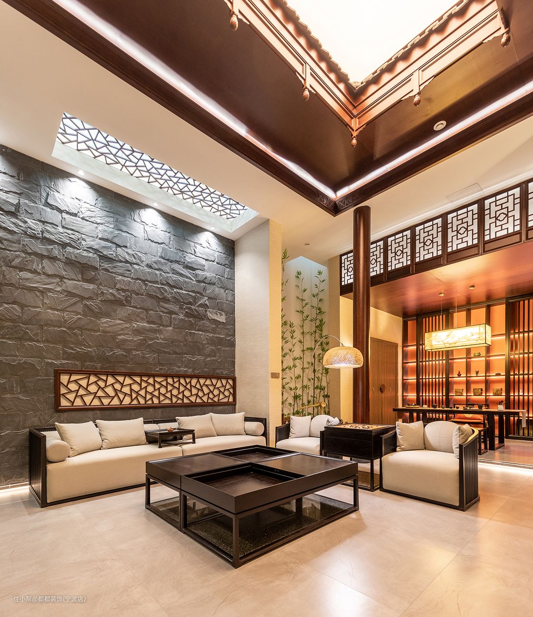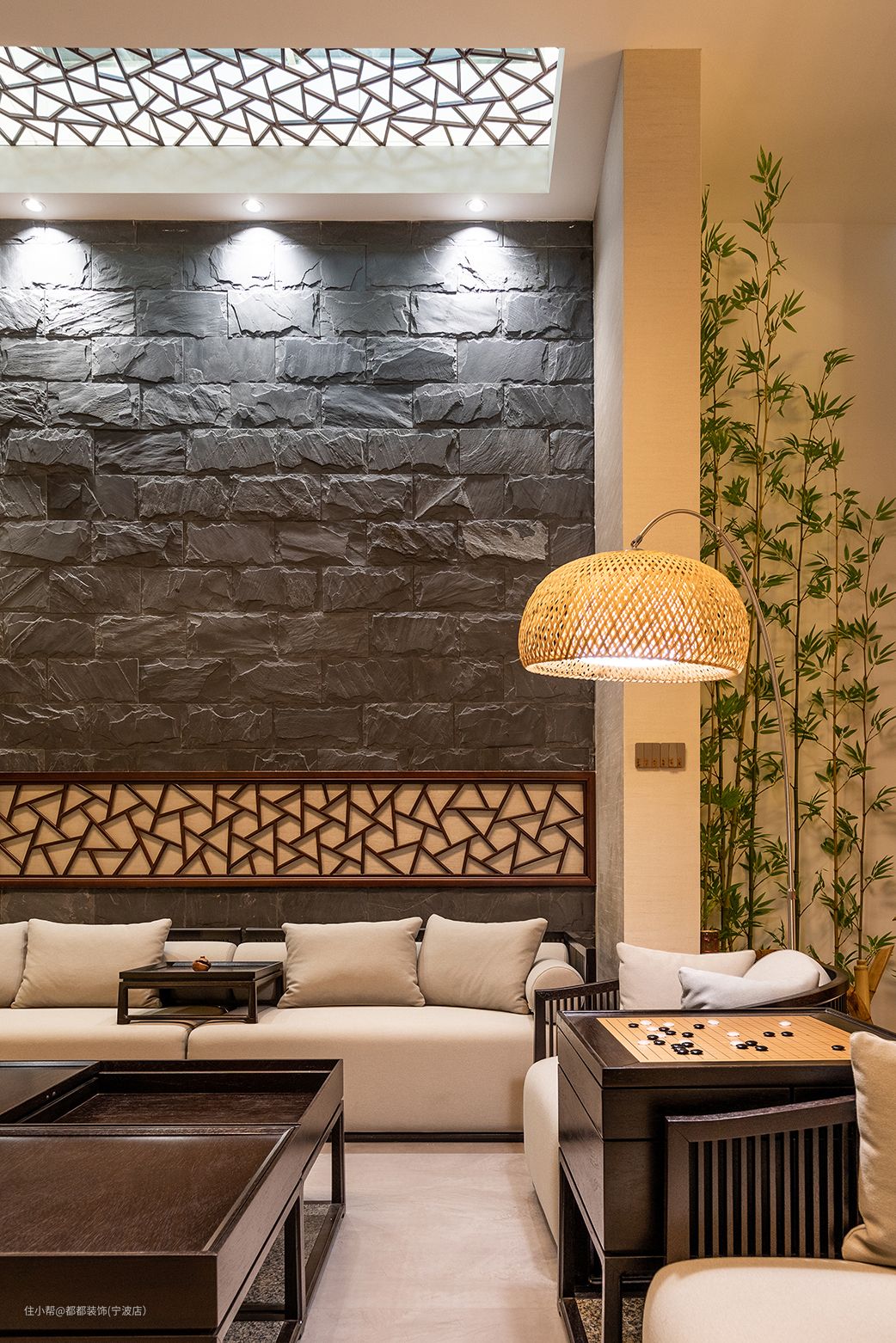 负一楼的禅茶室与会客厅,隔而不断,气韵相通,微弱的地台高低差自然的将屋主的专属品茶空间和会客厅两个区域稍作区隔,让空间看起来更宽敞。