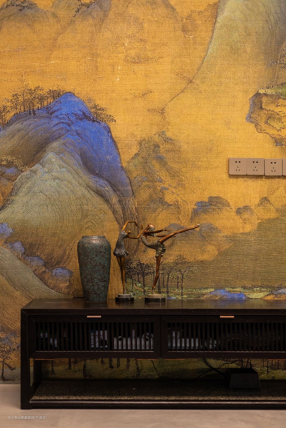 电视墙面以山水国画为主,丹青妙笔描绘出的高山湖泊,清波万顷,当一袭碧色于水中渲染,姿态变幻,勾勒出生活的惬意纯净,禅意花瓶搭配黑胡桃木电视柜给人—种贵气、雅致的感觉。