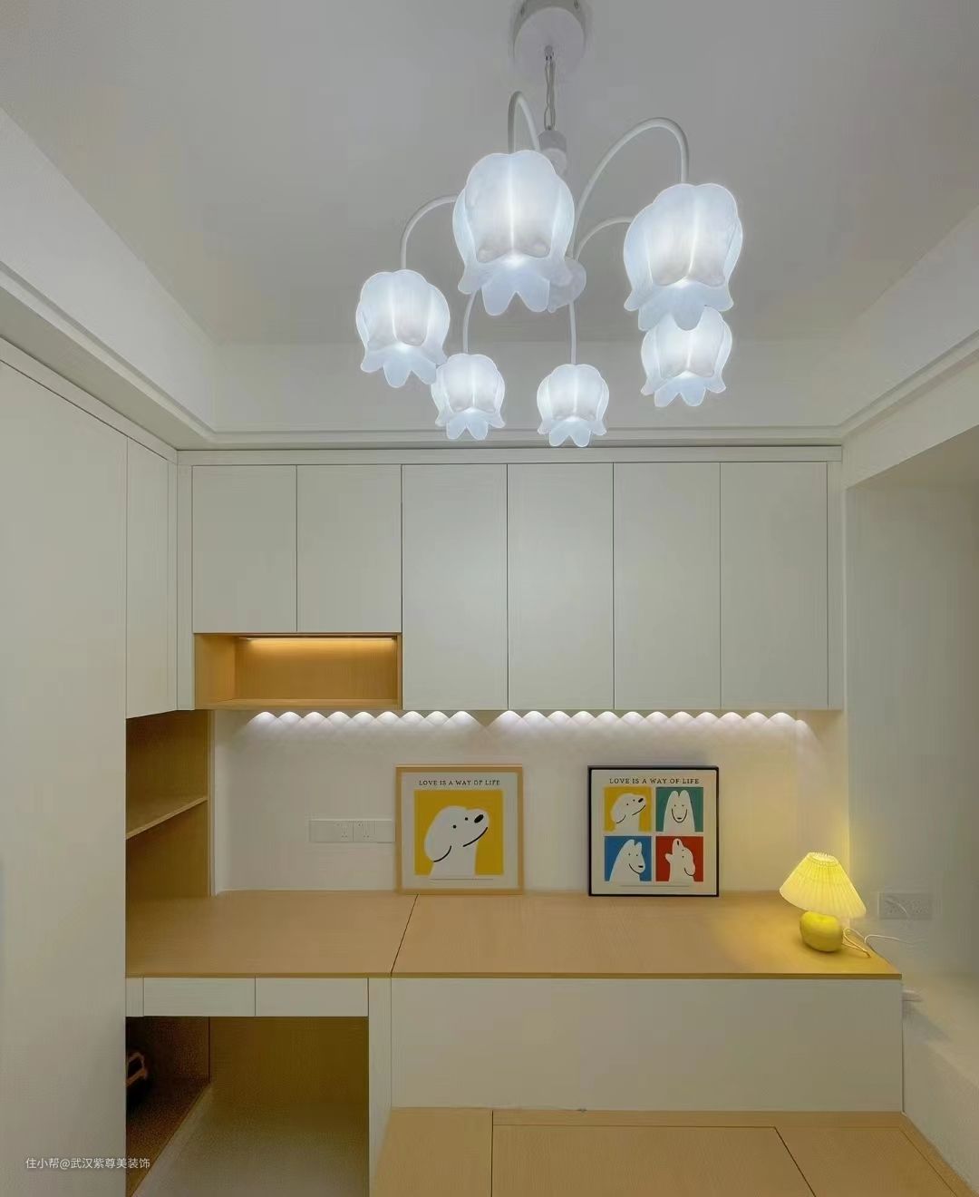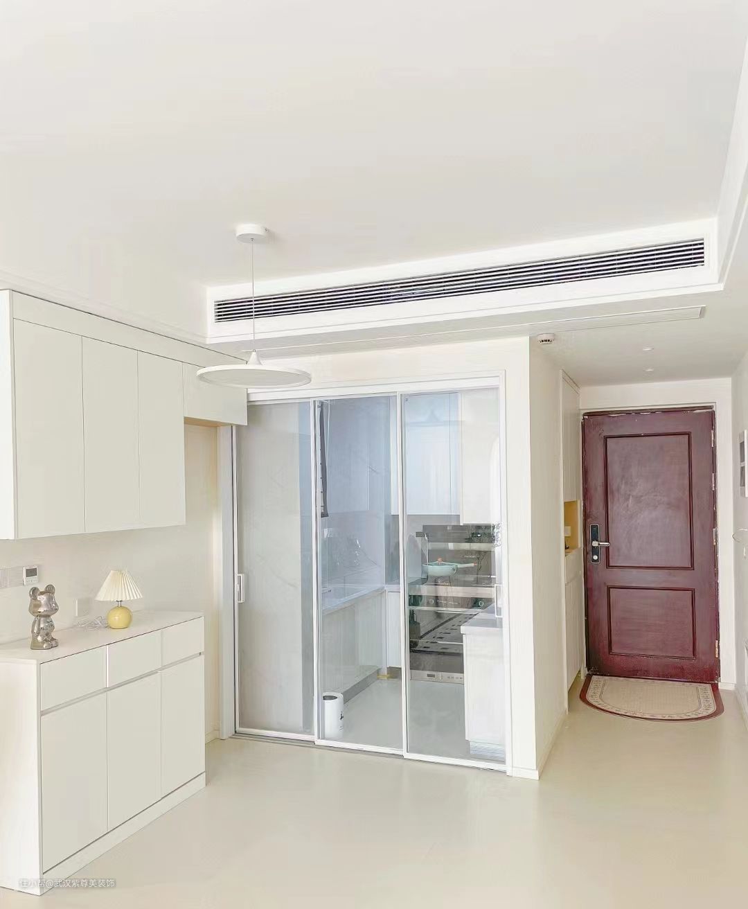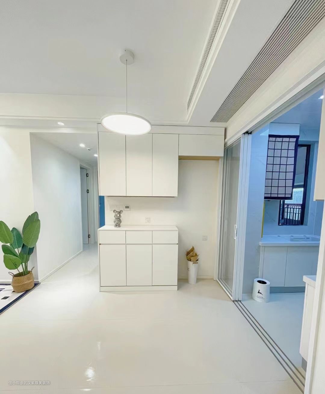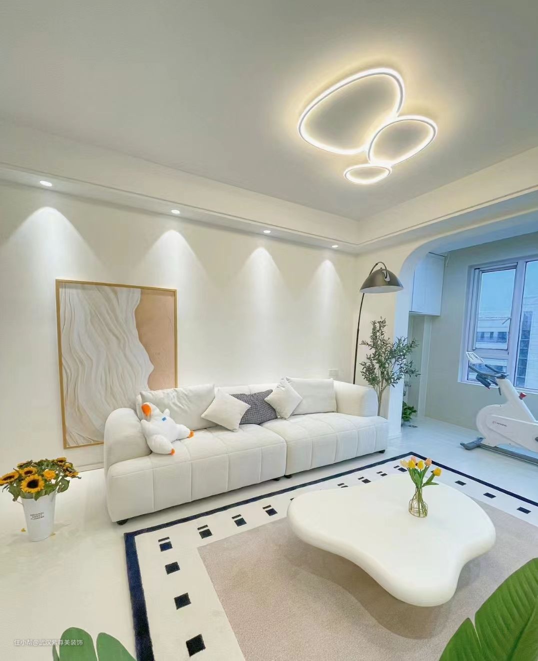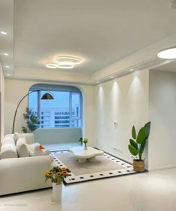 瓷砖:75*150cm 奶白色柔光砖 乳胶漆:珍珠白 灯光:四周4000k暖色射灯,打墙的绝美小山丘,中间是简约的吸顶灯不压层高