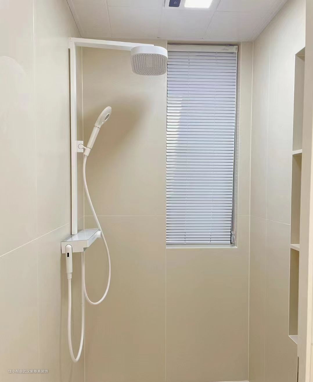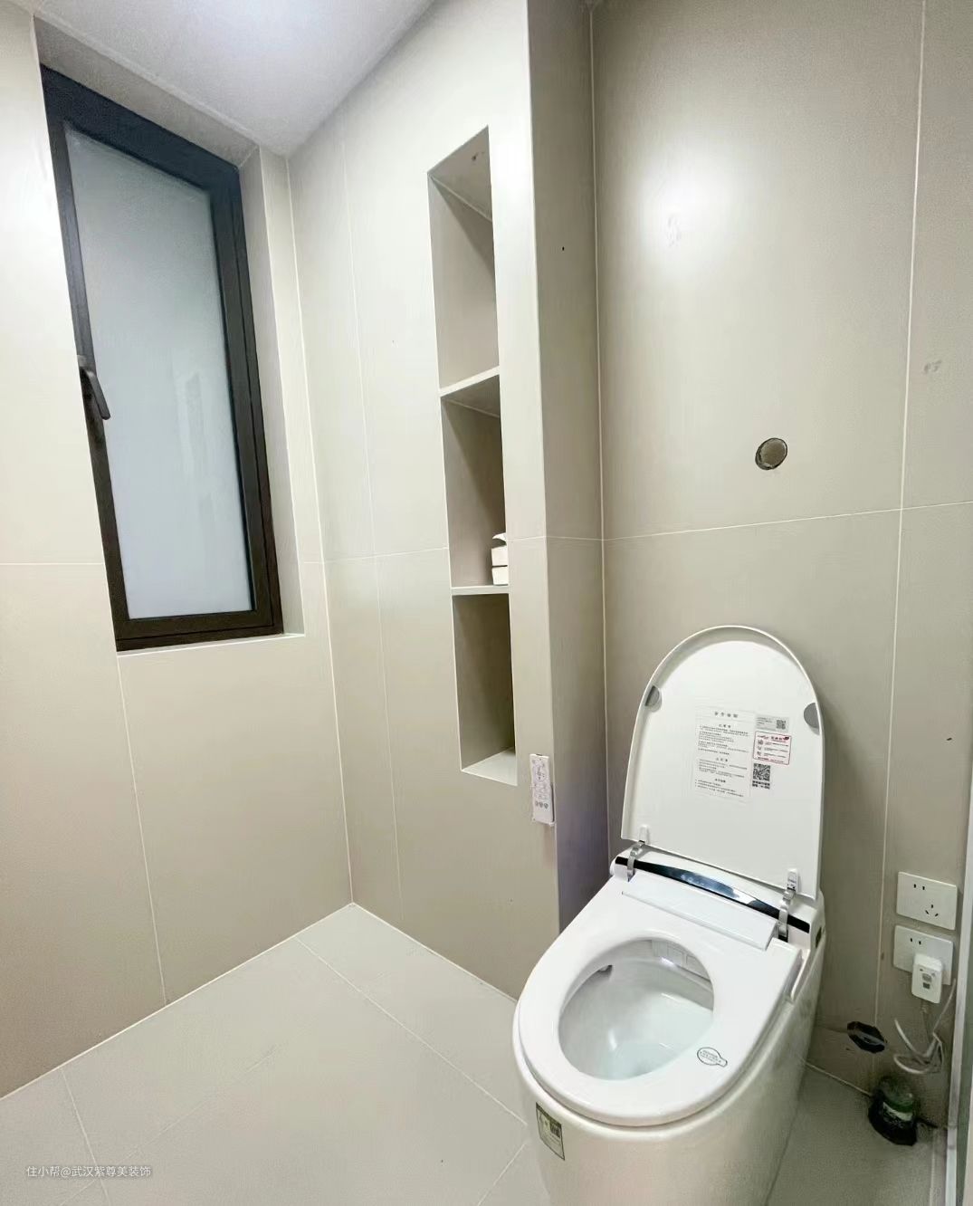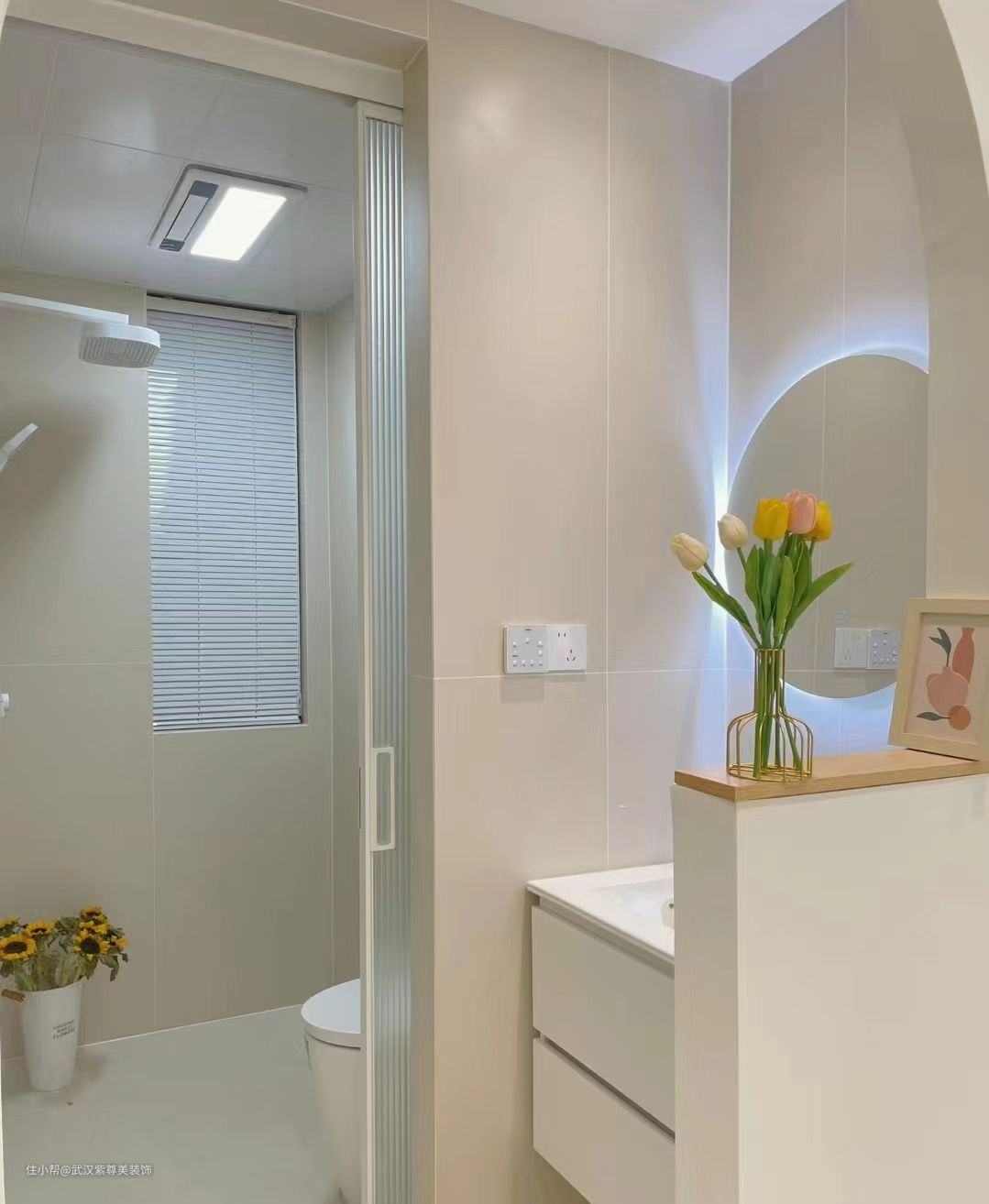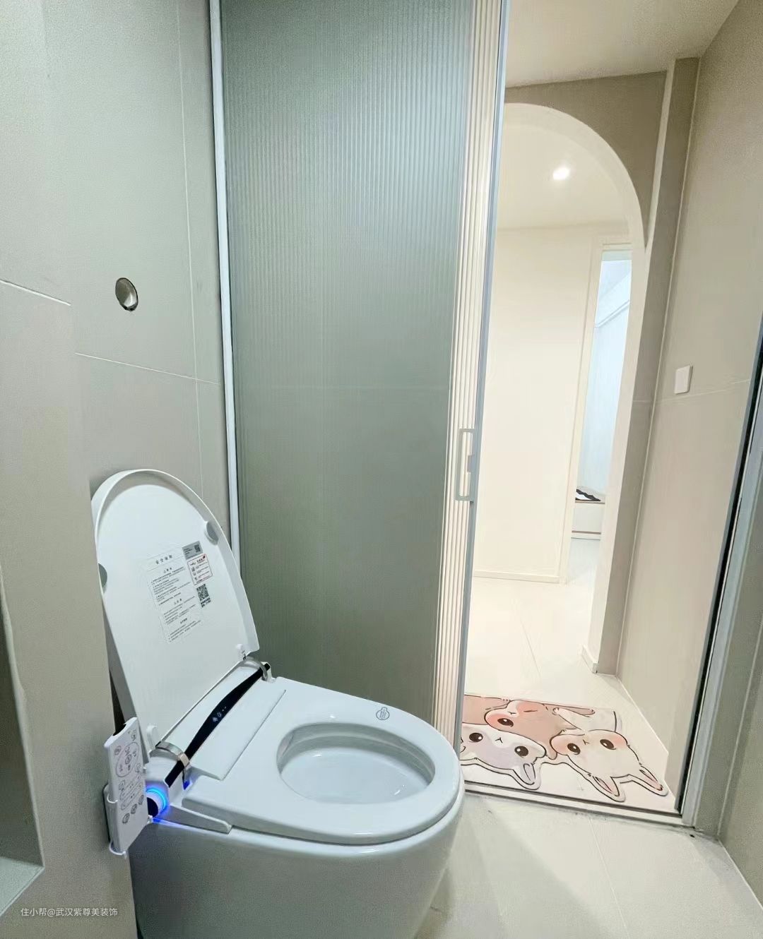 3.6平米的卫生间一样可以干湿分离,干区外置做半墙,做了拱形门洞,湿区做了壁龛放置洗漱用品,非常实用。瓷砖是奶白色60*120的,整体感非常好