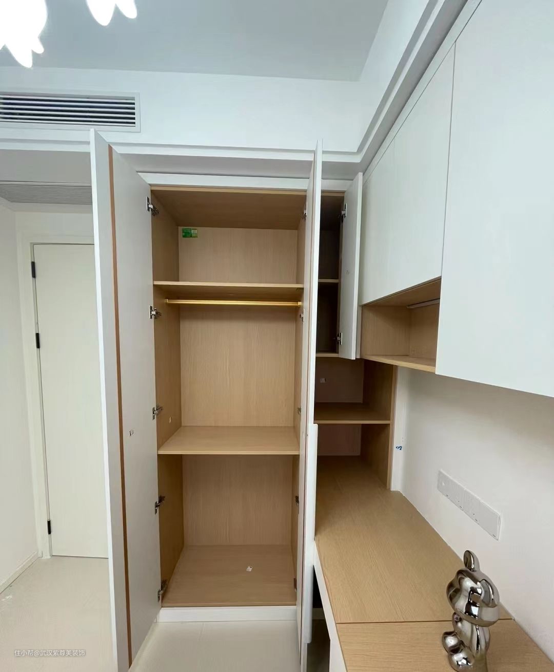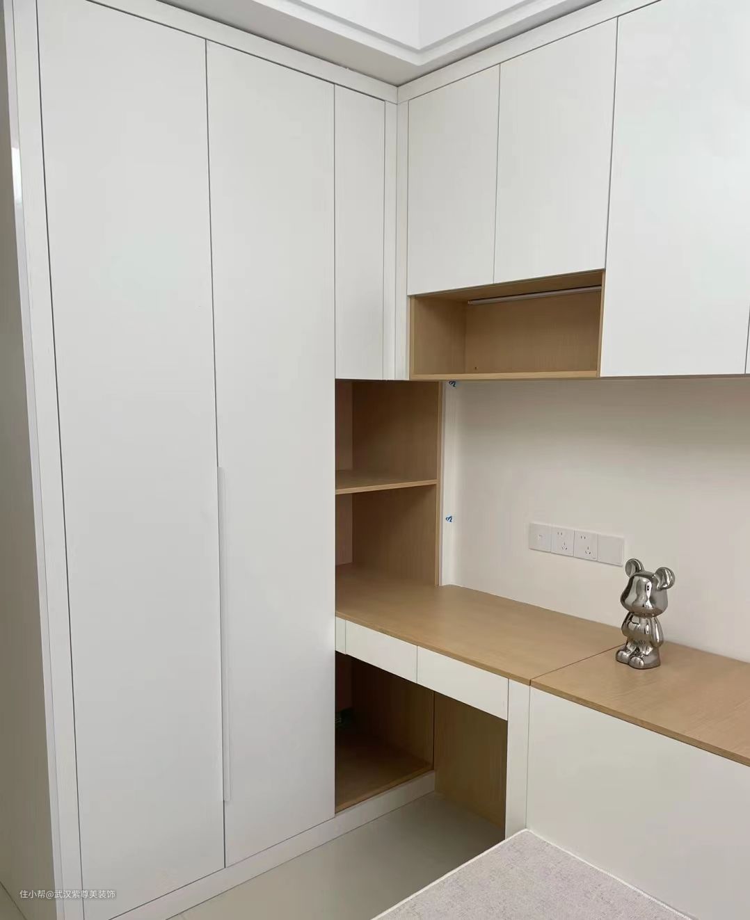 这个是次卧,背景墙可可蛋奶,非常温馨的配色, 由于面积只有8平,所以设计了榻榻米衣柜书桌一体式的,节约空间,平时榻榻米也能收纳,对于小户型来说真是的超级实用的。 这里给大家拍的比较详细,包括内部的空间,大家喜欢的可以参考。