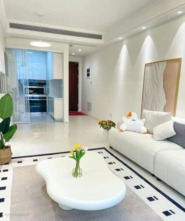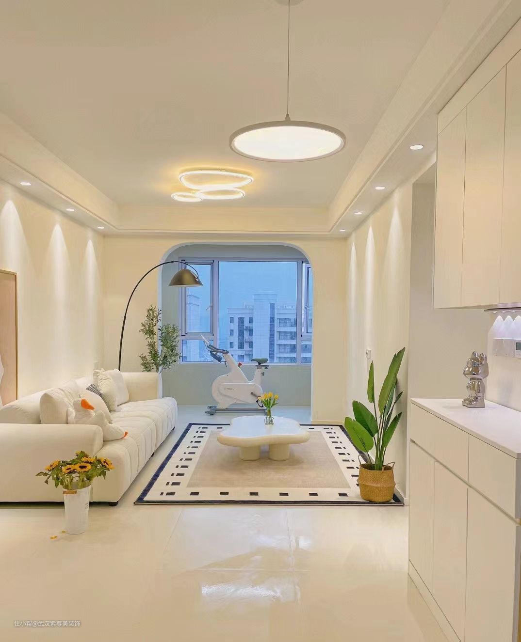 1拆掉推拉门,打通阳台封窗,客厅阳台一体 yyds! 2地砖通铺,宽敞又通透, 3全屋浅色系搭配,墙面珍珠白通刷,地面奶白色地砖,温馨显大 4吊顶是现在流行的双眼皮吊顶,不压层高不积灰,第①层30cm,第②层27cm,错层3cm