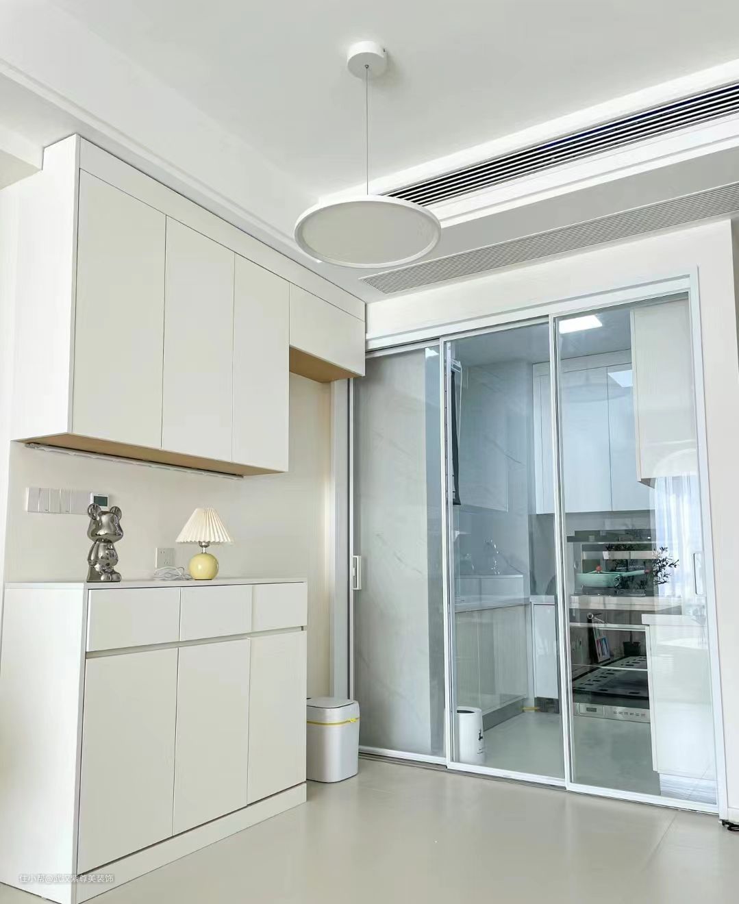从餐厅的第一张图可以看到厨房门改到了餐厅区域,原本厨房门的位置做了整面的玄关柜增加收纳,也不影响入户过道的宽度。餐厅这边做了一面餐边柜内嵌冰箱,收纳充足也不压抑