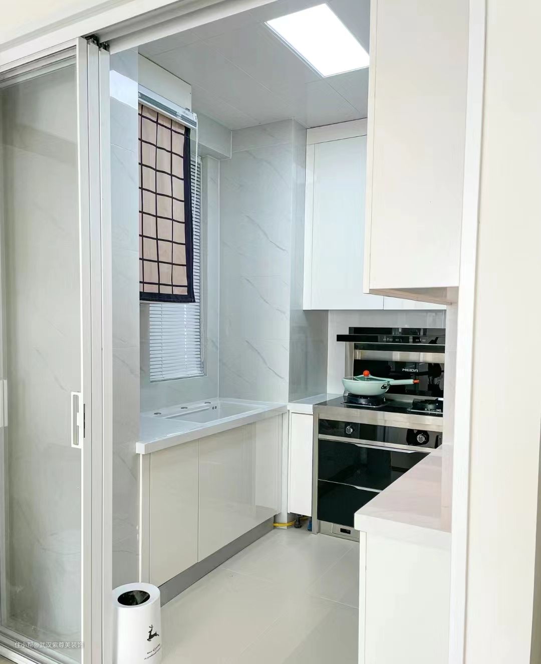 厨房做了三联动推拉门,整体是白色U型结构,动线短,橱柜台面操作空间充足。
