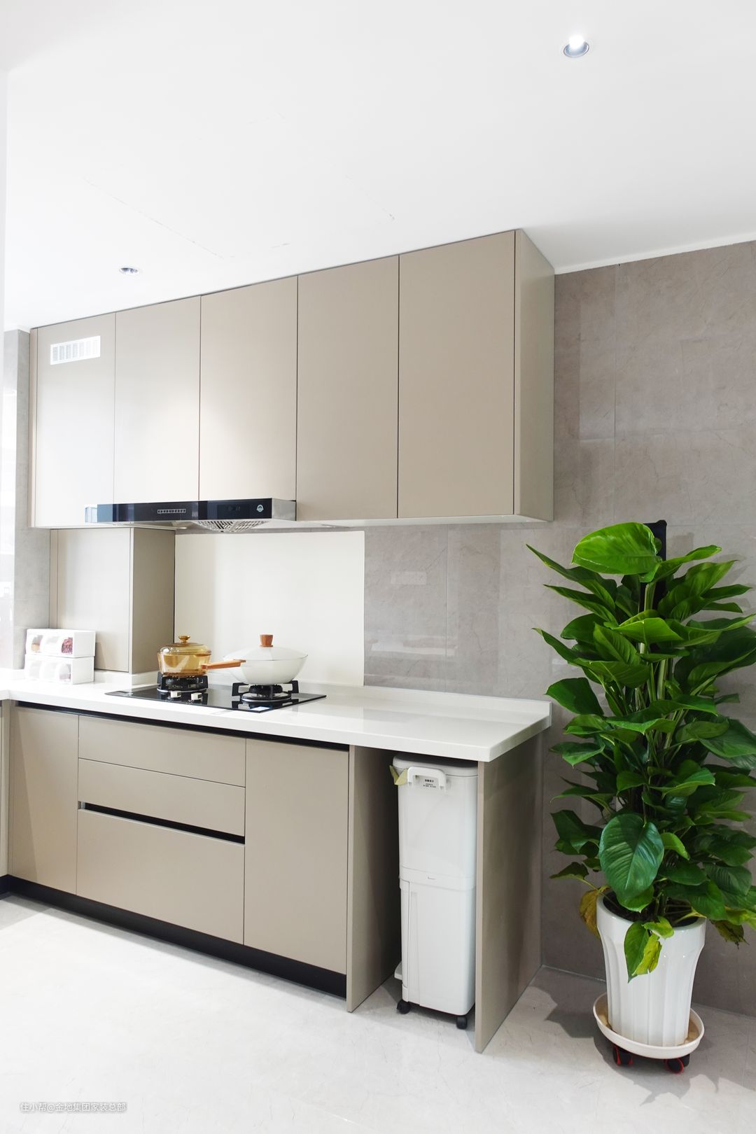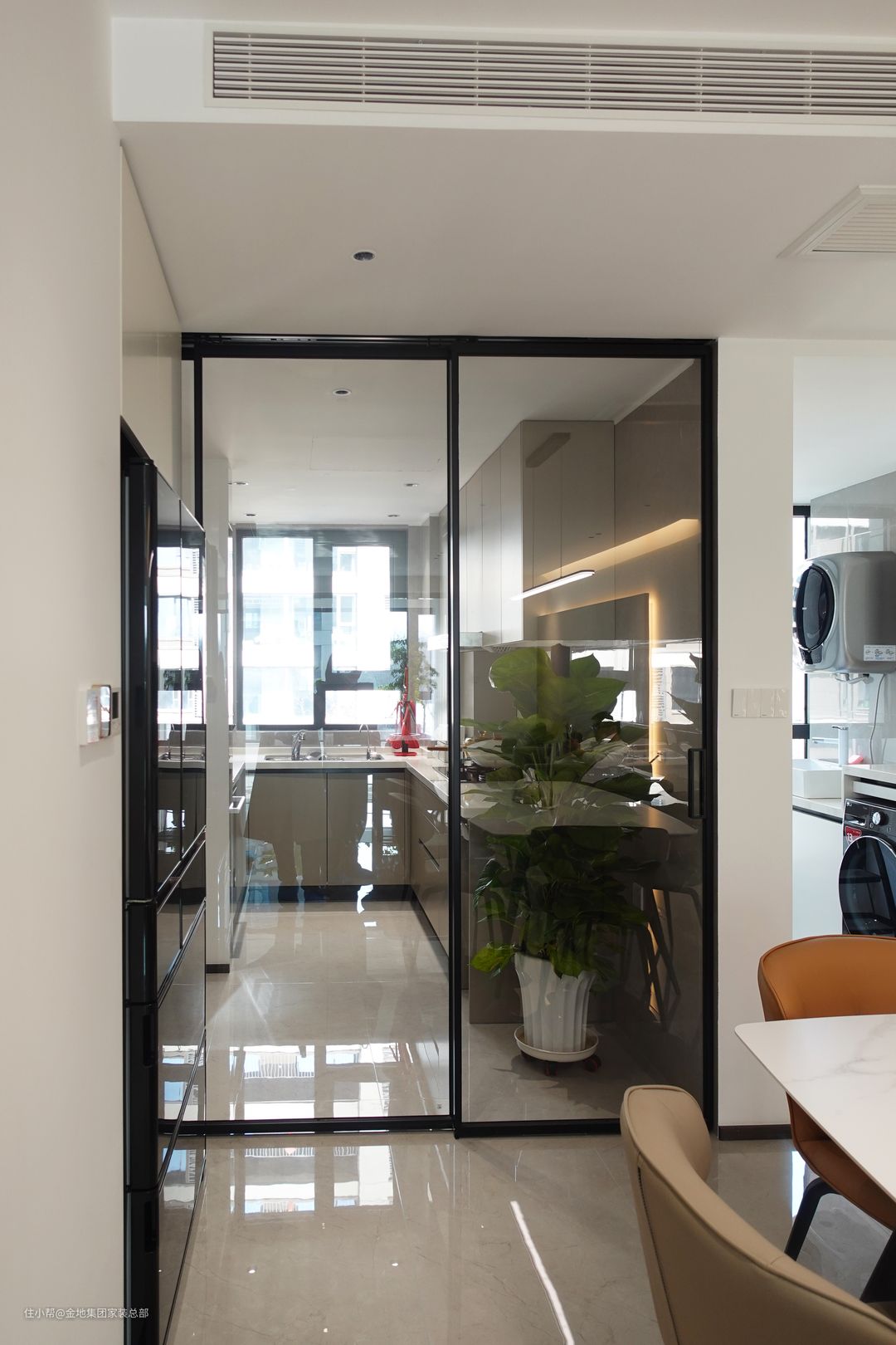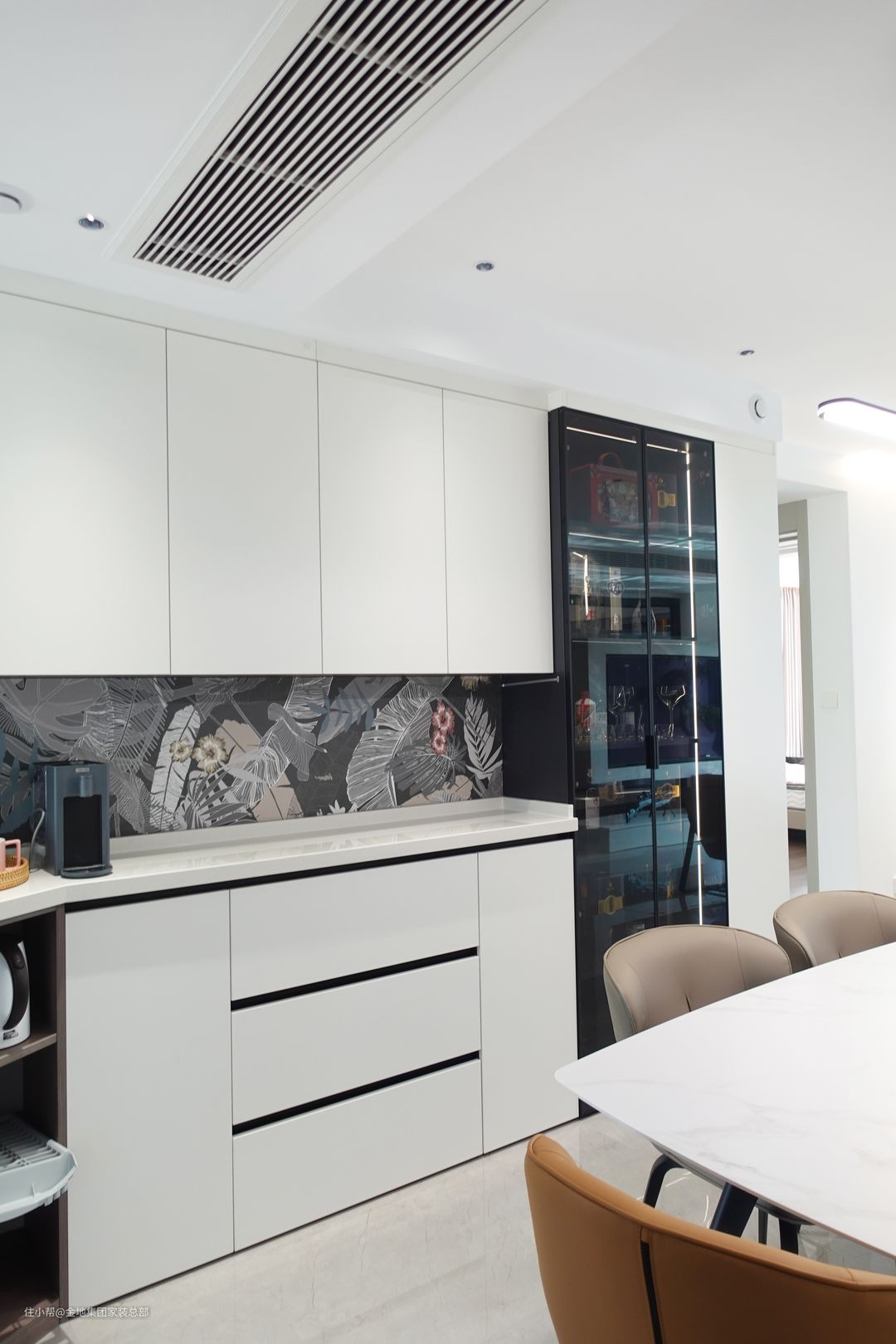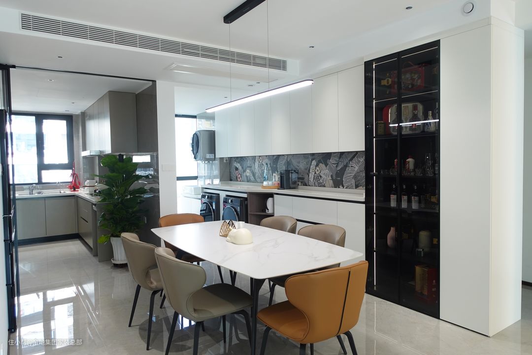 【设计思路】 1、 原来户型设有两个厨房,西厨和中厨,但郑先生对西厨房的需求不大,对这个设计不满意,因此设计师张老师将西厨改成了储物间,和餐厅连通。 2、 房子的风格为现代极简风,所以整体的硬装和软装都追求简约大方的效果,同时满足郑先生对舒适、温馨的氛围需求,在软装和灯光上尽量打造出柔软、温和的感觉。 3、 为提高实用性和收纳力,在餐厅、厨房等空间内“量身”定制储物餐边柜,预留出洗衣烘干机的位置,满足日常生活的需求又能符合赵先生一家的生活动线。
