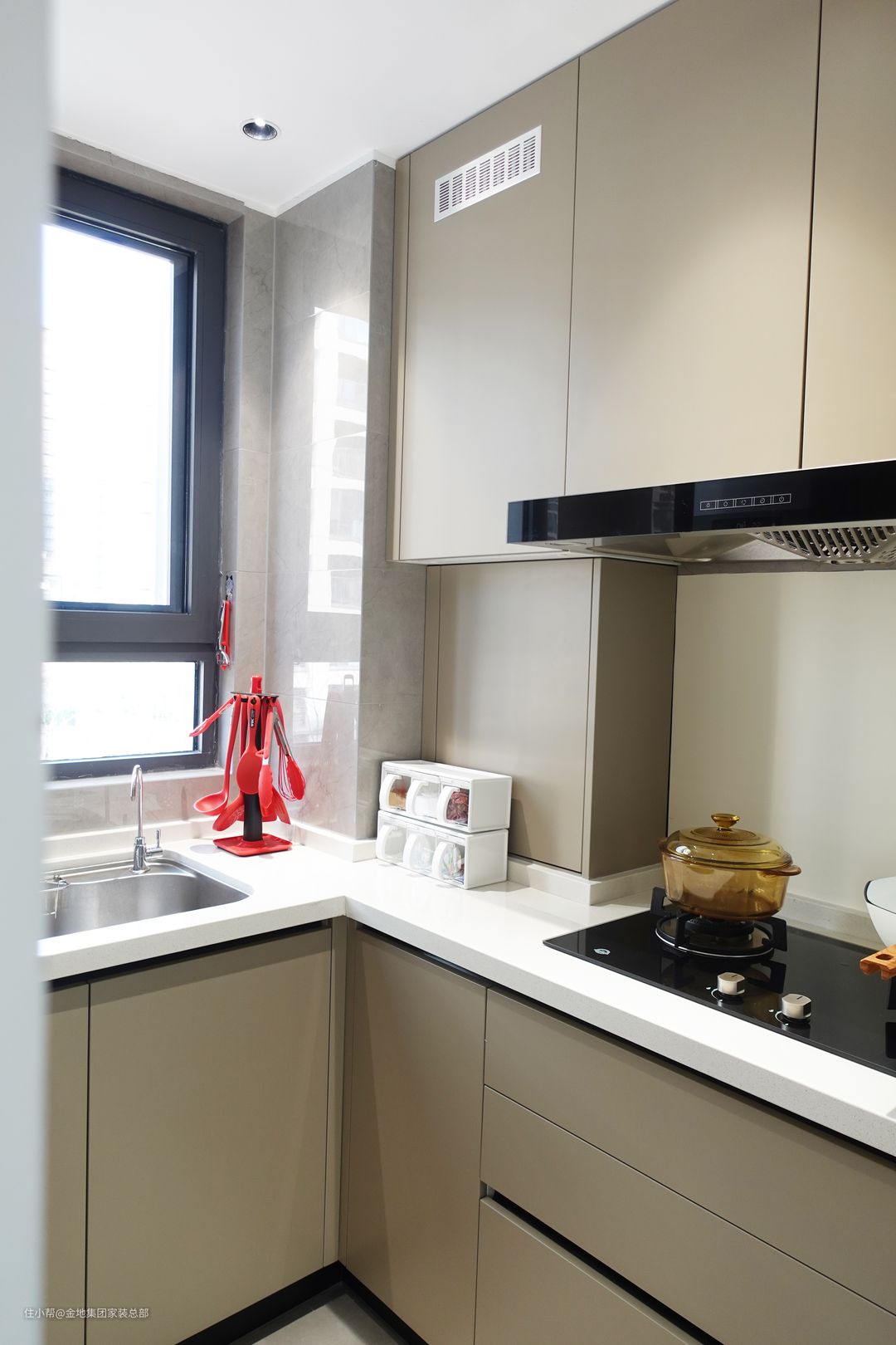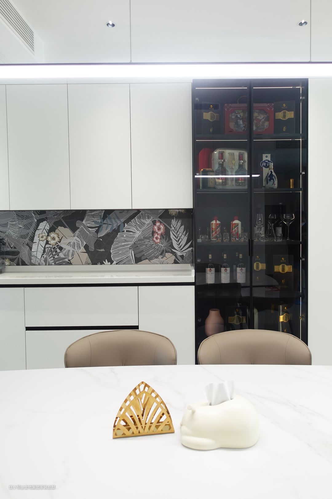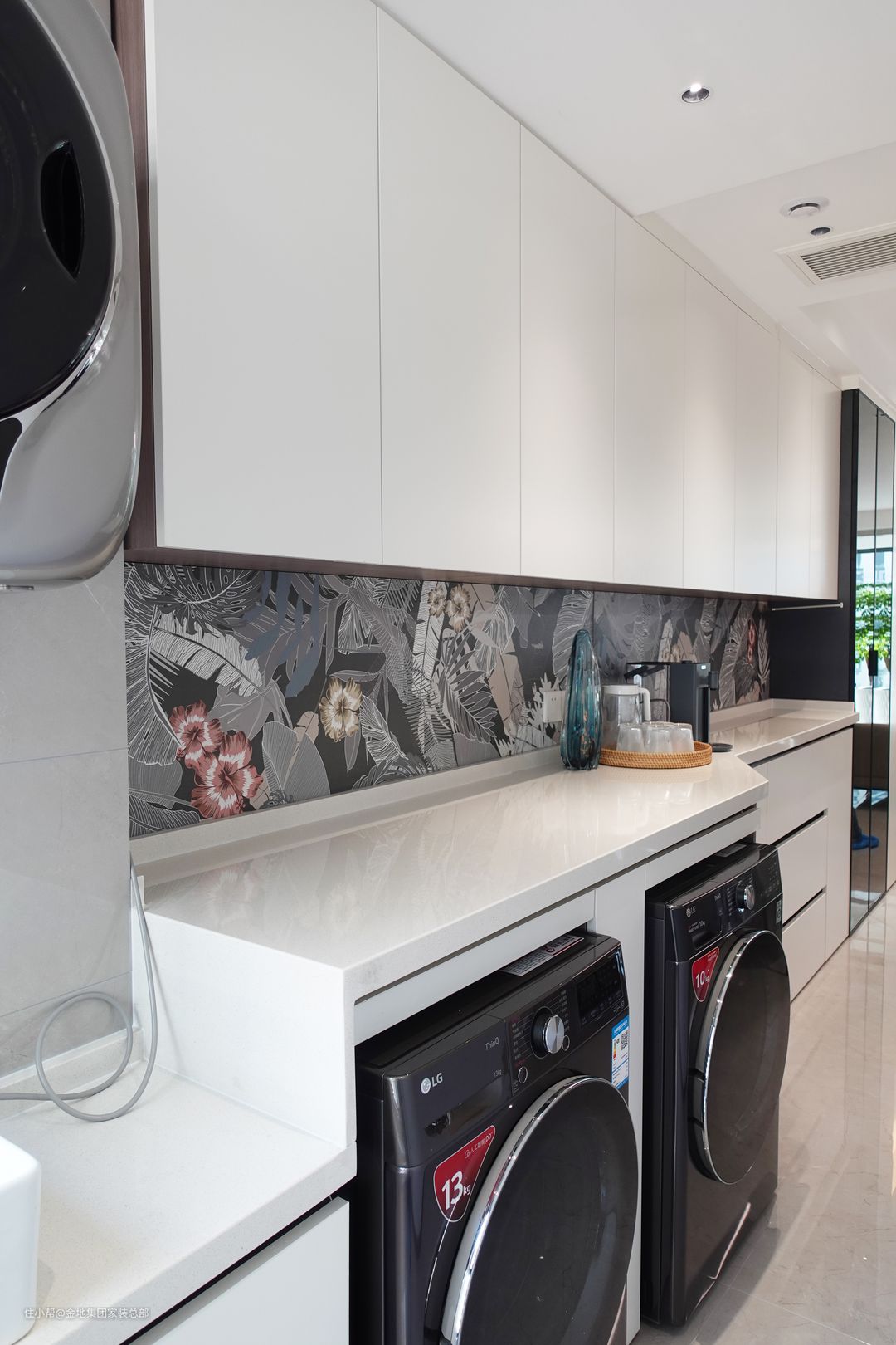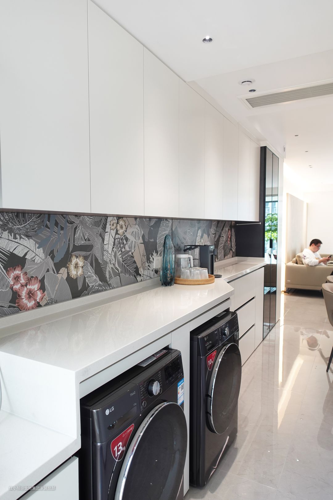 【设计思路】 1、 原来户型设有两个厨房,西厨和中厨,但郑先生对西厨房的需求不大,对这个设计不满意,因此设计师张老师将西厨改成了储物间,和餐厅连通。 2、 房子的风格为现代极简风,所以整体的硬装和软装都追求简约大方的效果,同时满足郑先生对舒适、温馨的氛围需求,在软装和灯光上尽量打造出柔软、温和的感觉。 3、 为提高实用性和收纳力,在餐厅、厨房等空间内“量身”定制储物餐边柜,预留出洗衣烘干机的位置,满足日常生活的需求又能符合赵先生一家的生活动线。